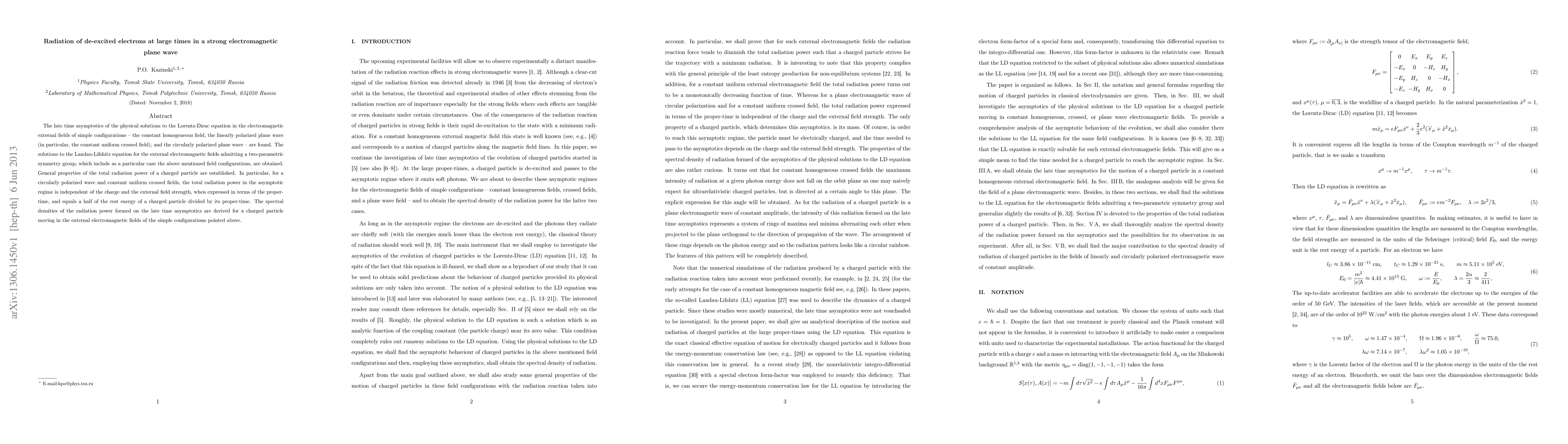 This paper investigates the late-time behavior of charged particles in strong electromagnetic plane waves, deriving the asymptotic radiation power and spectral densities for various configurations, including constant fields and polarized waves. Notably, it finds that for circularly polarized waves and constant crossed fields, the asymptotic radiation power is independent of charge and field strength, equating to half the rest energy per proper-time.