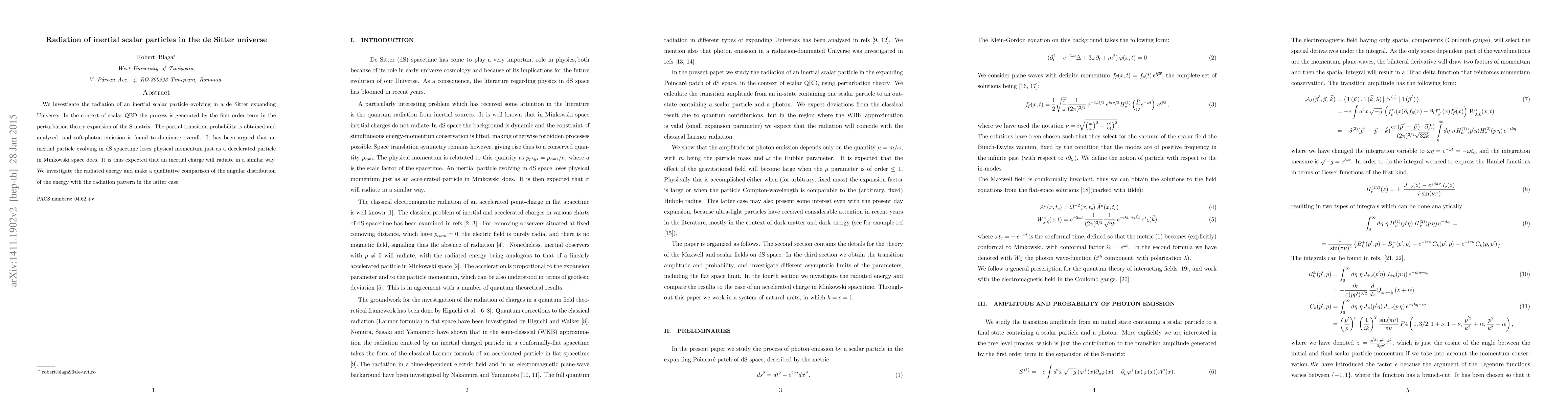 This paper investigates how an inertial scalar particle radiates energy in a de Sitter expanding Universe, finding that soft-photon emission dominates and the angular distribution of energy is similar to a decelerated particle in Minkowski space.