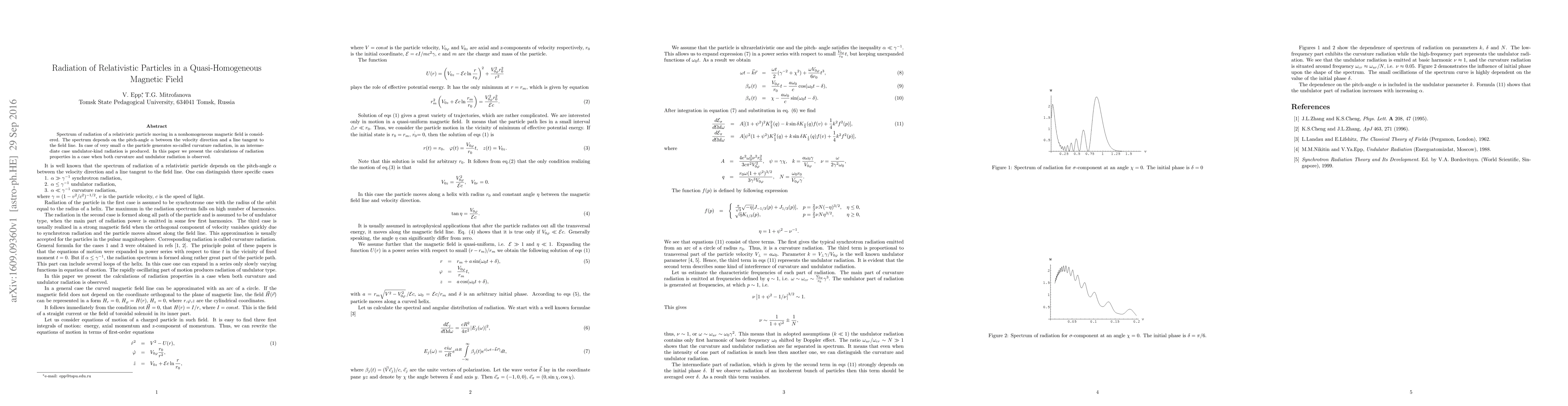This paper investigates the spectrum of radiation emitted by relativistic particles in a quasi-homogeneous magnetic field, focusing on both curvature and undulator radiation depending on the pitch-angle between the particle's velocity and the magnetic field line. Calculations detail the radiation properties when both types of radiation occur.