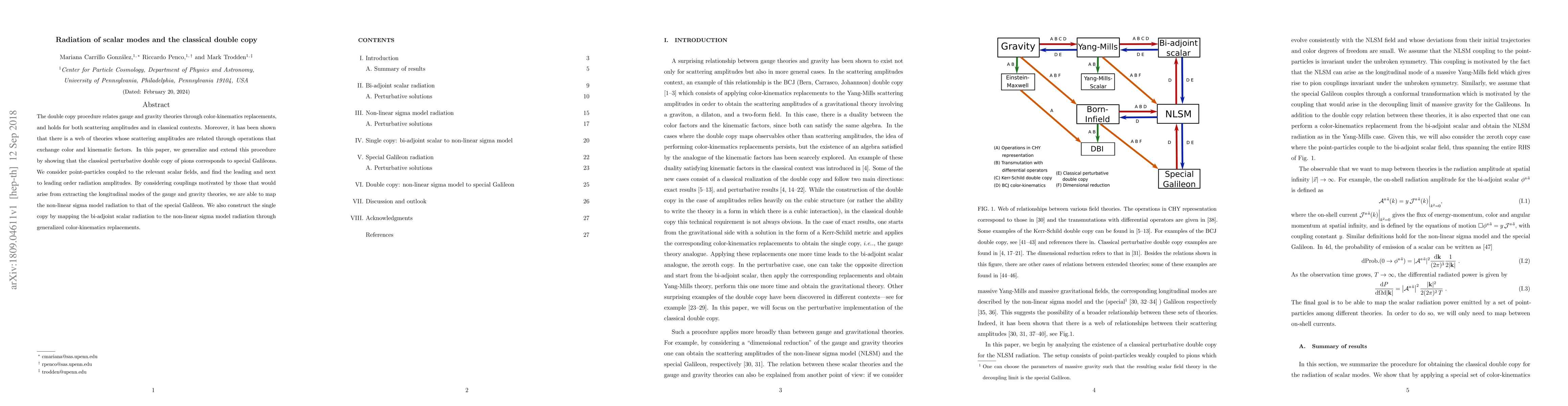 This paper explores the classical double copy structure in radiation of scalar modes, showing that the perturbative double copy of pions corresponds to special Galileons. It constructs the single copy by mapping bi-adjoint scalar radiation to non-linear sigma model radiation using generalized color-kinematics replacements.