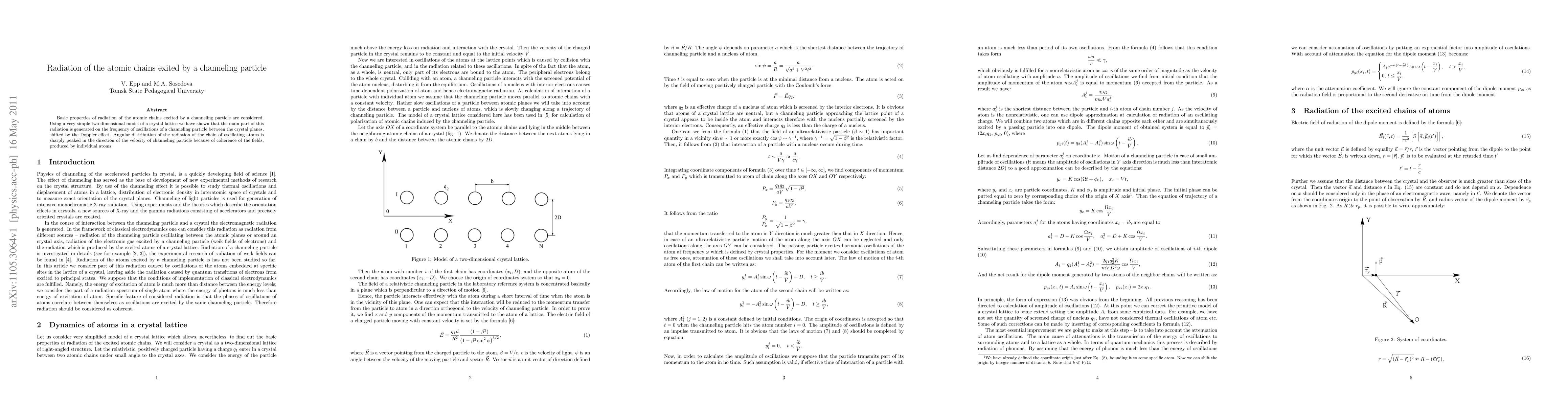 This paper investigates the radiation emitted by atomic chains excited by a channeling particle, demonstrating that the primary radiation frequency is influenced by the Doppler effect due to the particle's oscillations between crystal planes. The angular distribution of this radiation is highly concentrated in the direction of the channeling particle's velocity due to the coherence of the fields generated by the oscillating atoms.