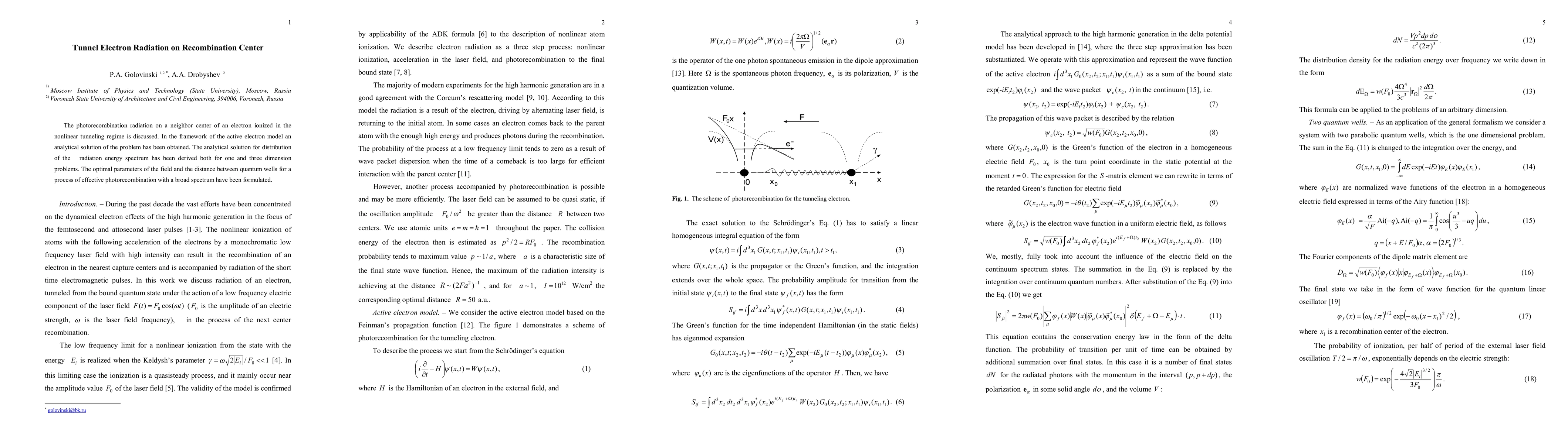 The photorecombination radiation on a neighbor center of an electron ionized in the nonlinear tunneling regime is discussed. In the framework of the active electron model an analytical solution of the problem has been obtained. The analytical solution for distribution of the radiation energy spectrum has been derived both for one and three dimension problems. The optimal parameters of the field and the distance between quantum wells for a process of effective photorecombination with a broad spectrum have been formulated.