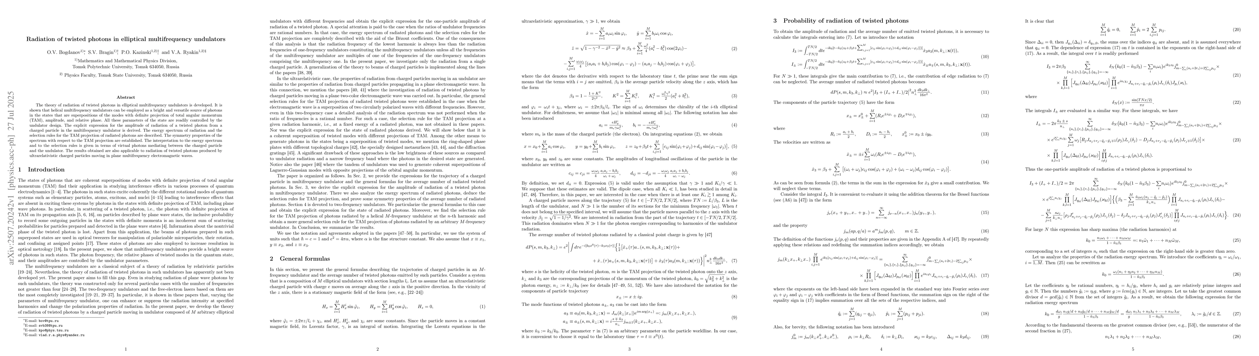 The theory of radiation of twisted photons in elliptical multifrequency undulators is developed. It is shown that helical multifrequency undulators can be employed as a bright and versatile source of photons in the states that are superpositions of the modes with definite projection of total angular momentum (TAM), amplitude, and relative phase. All these parameters of the state are readily controlled by the undulator design. The explicit expression for the amplitude of radiation of a twisted photon from a charged particle in the multifrequency undulator is derived. The energy spectrum of radiation and the selection rules for the TAM projection of radiated photons are described. The symmetry properties of the spectrum with respect to the TAM projection are established. The interpretation to the energy spectrum and to the selection rules is given in terms of virtual photons mediating between the charged particle and the undulator. The results obtained are also applicable to radiation of twisted photons produced by ultrarelativistic charged particles moving in plane multifrequency electromagnetic waves.