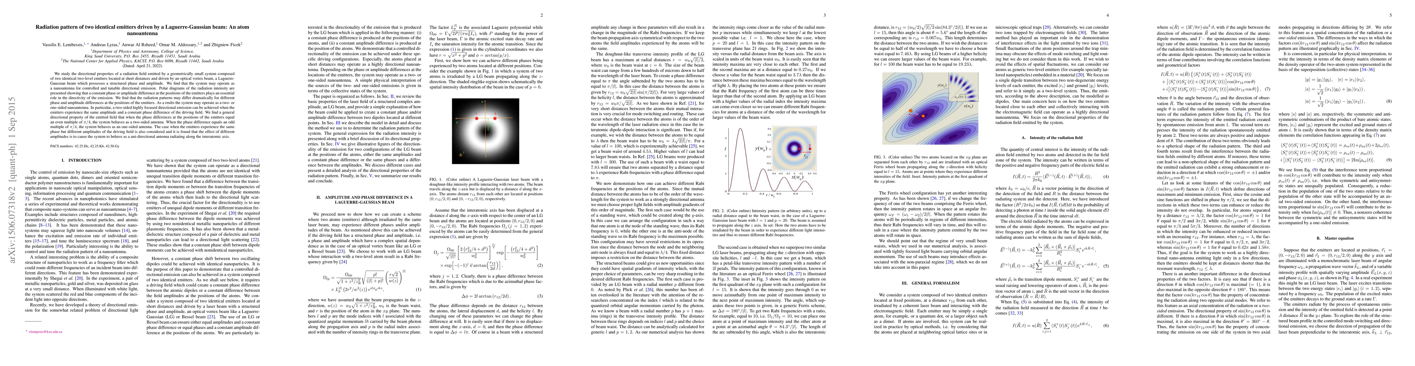 This paper investigates the radiation pattern of two identical emitters driven by a Laguerre-Gaussian beam, demonstrating that the system can function as a tunable nanoantenna. The study reveals that the directivity of the emission is highly dependent on the phase and amplitude differences between the emitters, leading to either two-sided or one-sided directional radiation.