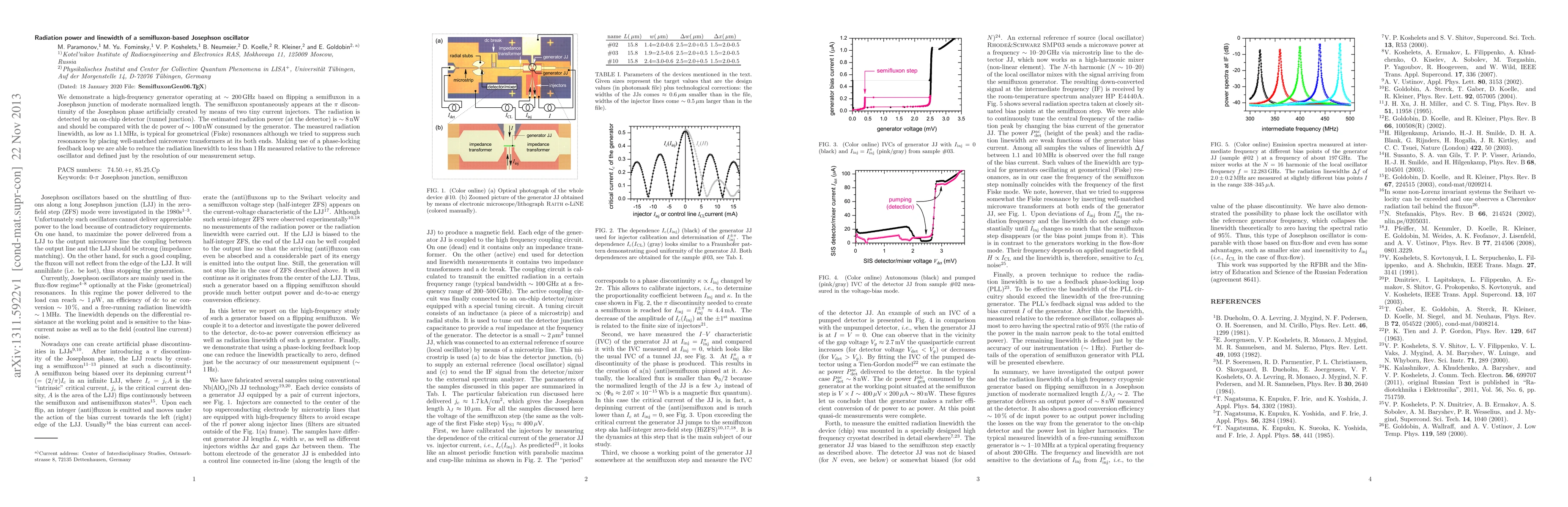 This paper presents a high-frequency generator operating at ~200GHz based on a semifluxon in a Josephson junction, achieving an estimated radiation power of ~8nW and a linewidth as low as 1.1MHz. Phase-locking feedback reduces the linewidth to less than 1Hz.