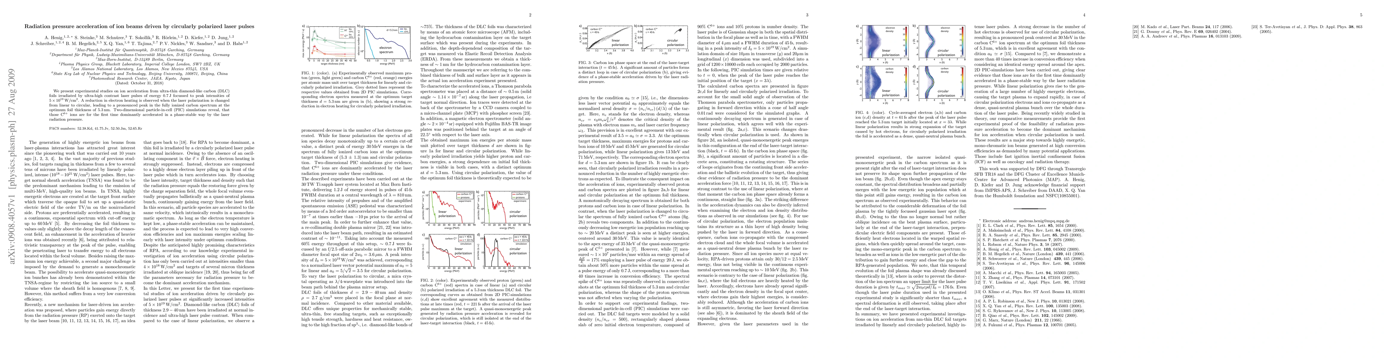 Summary: Experimental studies show that circularly polarized laser pulses effectively accelerate ion beams from ultra-thin DLC foils, with reduced electron heating compared to linear polarization. Simulations reveal that C^{6+} ions are primarily accelerated by radiation pressure in a stable manner.