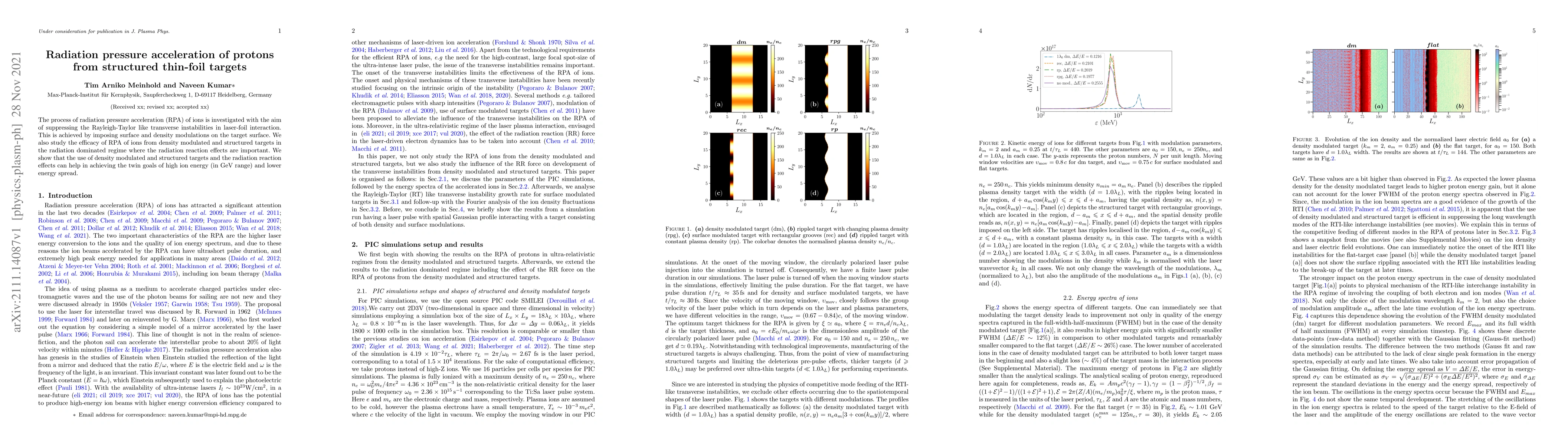 This research investigates the radiation pressure acceleration of protons from structured thin-foil targets to suppress transverse instabilities in laser-foil interactions. It demonstrates that using density modulated and structured targets, along with radiation reaction effects, can achieve high proton energies in the GeV range with reduced energy spread.