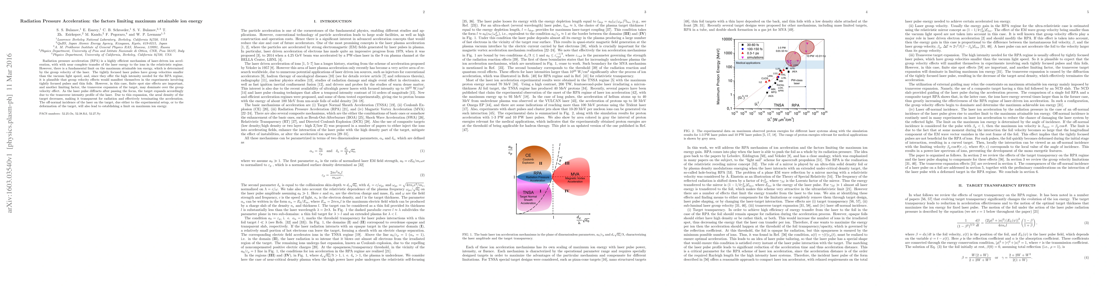 This paper investigates the fundamental limits on maximum ion energy in radiation pressure acceleration, identifying group velocity and transverse target expansion as key factors. It concludes that transverse expansion often dominates, terminating acceleration as the target becomes transparent to radiation.