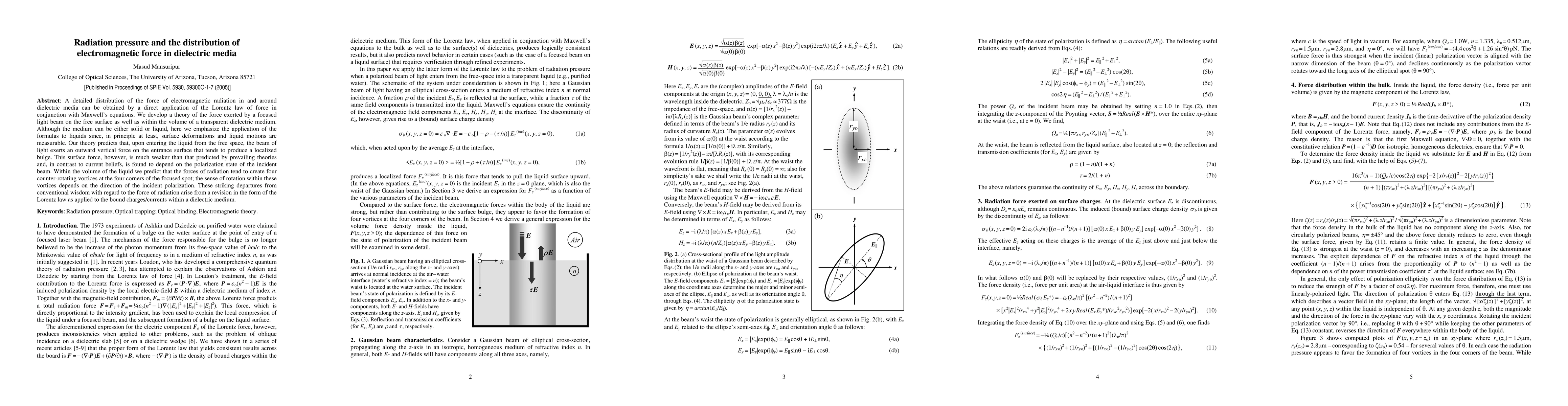 This paper develops a new theory for the distribution of electromagnetic radiation force in dielectric media, emphasizing liquid applications. It predicts weaker, polarization-dependent surface forces and four counter-rotating vortices within the medium, challenging conventional theories based on revised Lorentz law applications.