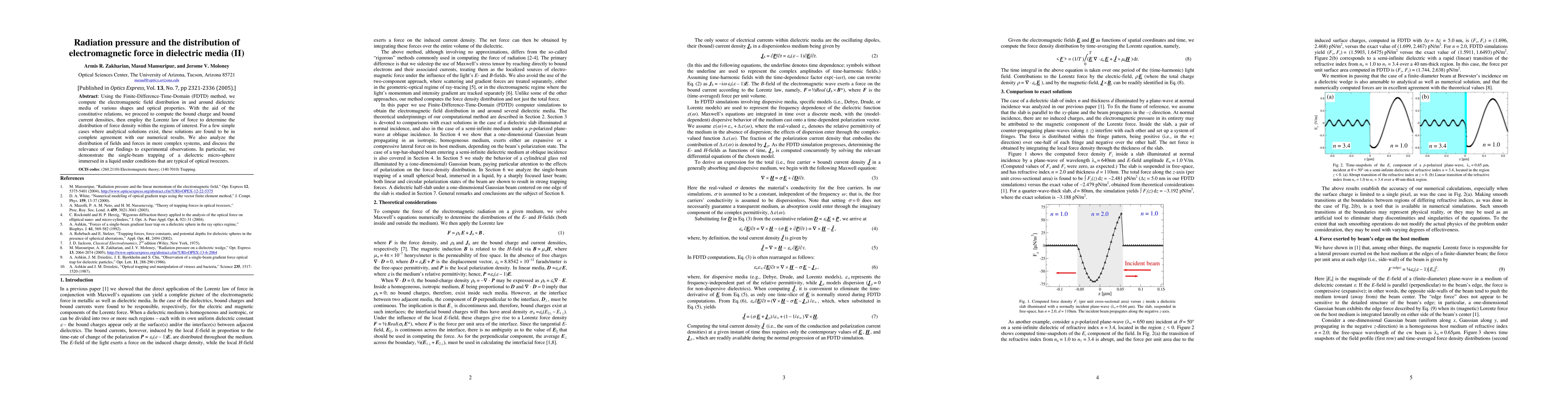 This paper uses the FDTD method to compute electromagnetic field distributions in various dielectric media, calculates bound charge and current densities, and determines force-density distributions using the Lorentz law. The findings align with analytical solutions for simple cases and demonstrate single-beam trapping of dielectric micro-spheres, relevant to optical tweezers.
