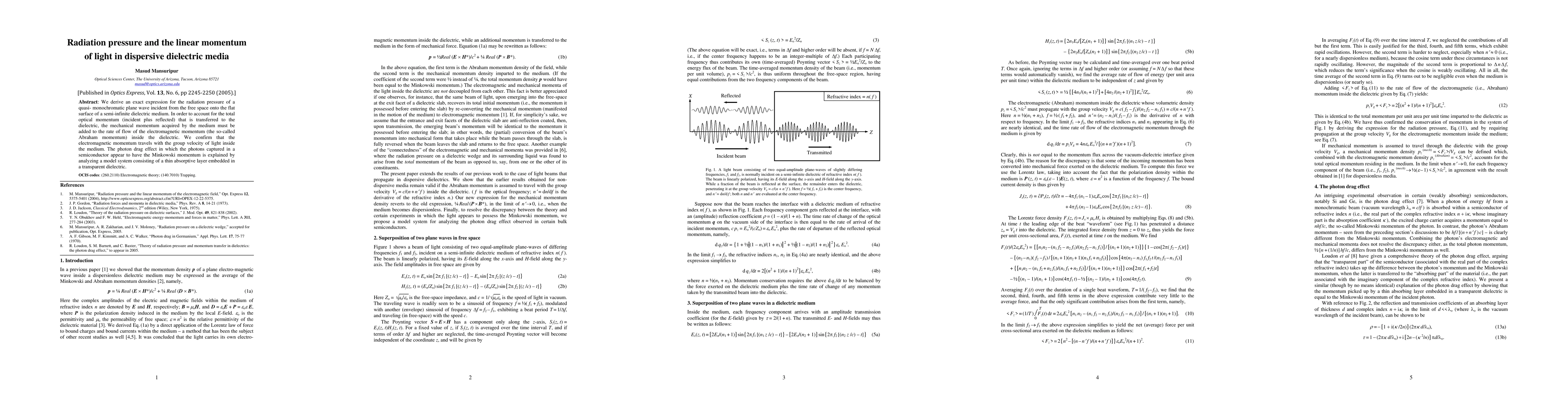 This paper derives an exact expression for radiation pressure on a dielectric medium, considering both incident and reflected light, and confirms that electromagnetic momentum travels with the group velocity. It also explains the photon drag effect in semiconductors using a model system.