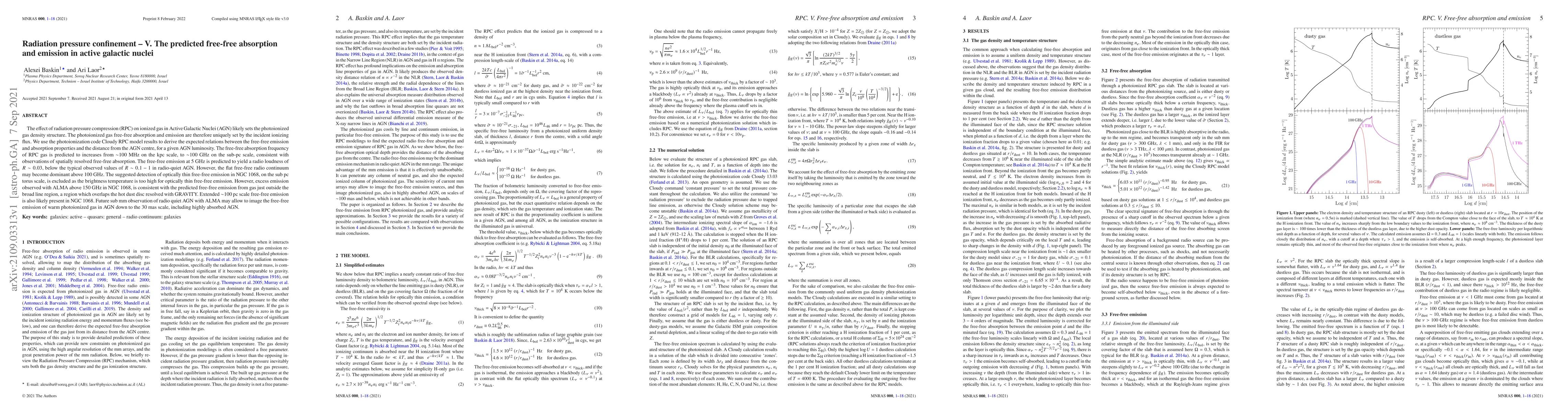 This paper investigates the impact of radiation pressure compression on the free-free absorption and emission in Active Galactic Nuclei (AGN), using the Cloudy RPC model. It predicts increasing free-free absorption frequency from 100 MHz to 100 GHz with proximity to the AGN center, consistent with observations.