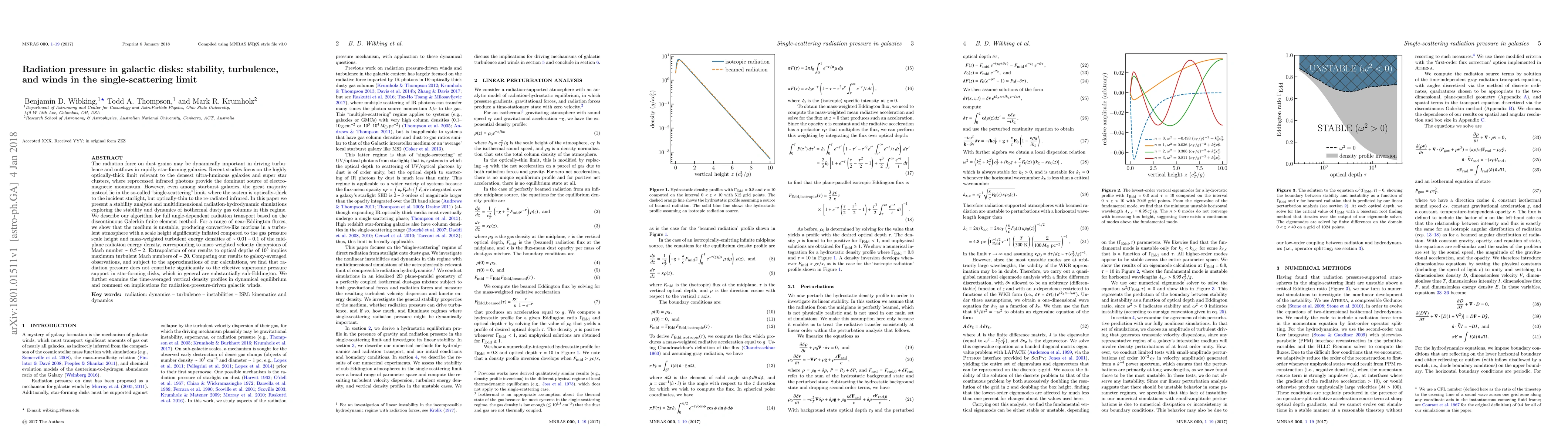 This paper investigates the stability and dynamics of isothermal dusty gas columns in galactic disks under the single-scattering limit, using stability analysis and multidimensional radiation-hydrodynamic simulations. The study finds that the medium becomes unstable, generating turbulent atmospheres with significant convective-like motions and inflated scale heights, though radiation pressure does not significantly contribute to the overall supersonic pressure support in star-forming disks.