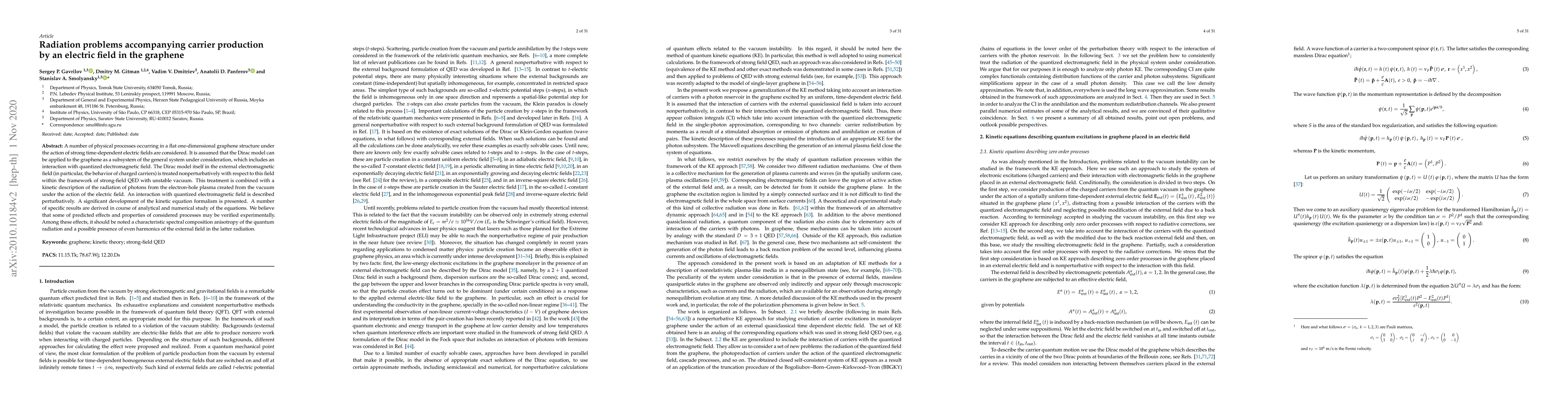 A number of physical processes occurring in a flat one-dimensional graphene structure under the action of strong time-dependent electric fields are considered. It is assumed that the Dirac model can be applied to the graphene as a subsystem of the general system under consideration, which includes an interaction with quantized electromagnetic field. The Dirac model itself in the external electromagnetic field (in particular, the behavior of charged carriers) is treated nonperturbatively with respect to this field within the framework of strong-field QED with unstable vacuum. This treatment is combined with a kinetic description of the radiation of photons from the electron-hole plasma created from the vacuum under the action of the electric field. An interaction with quantized electromagnetic field is described perturbatively. A significant development of the kinetic equation formalism is presented. A number of specific results are derived in course of analytical and numerical study of the equations. We believe that some of predicted effects and properties of considered processes may be verified experimentally. Among these effects, it should be noted a characteristic spectral composition anisotropy of the quantum radiation and a possible presence of even harmonics of the external field in the latter radiation.