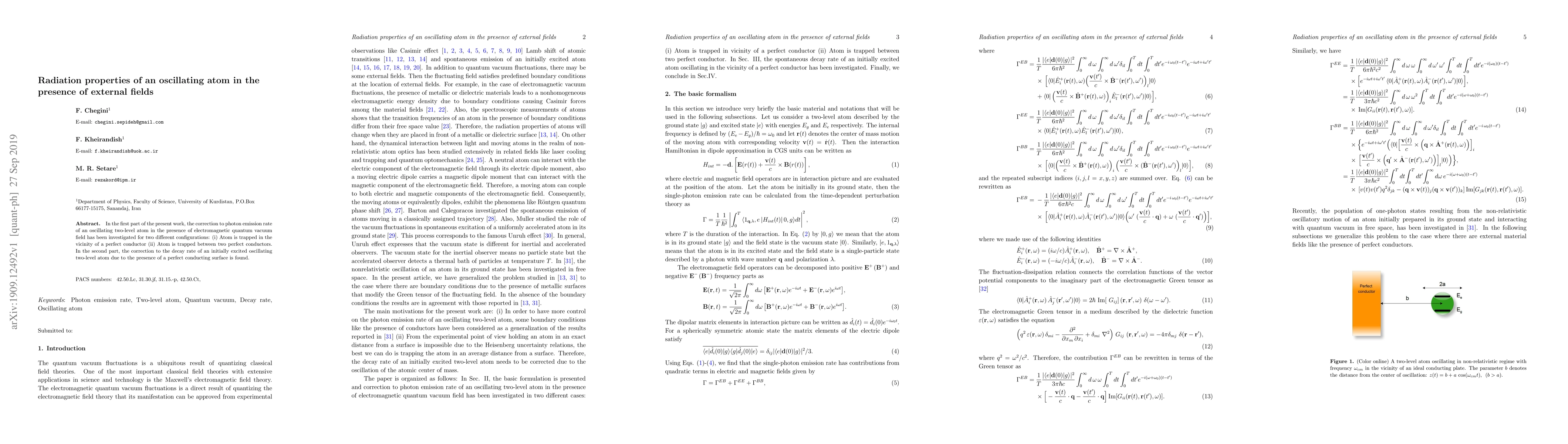 This research examines how external electromagnetic fields, specifically from perfect conductors, affect the radiation properties of an oscillating two-level atom. It calculates corrections to photon emission rates in two configurations - near a single conductor and between two conductors - and also determines the impact of a conducting surface on an excited atom's decay rate.