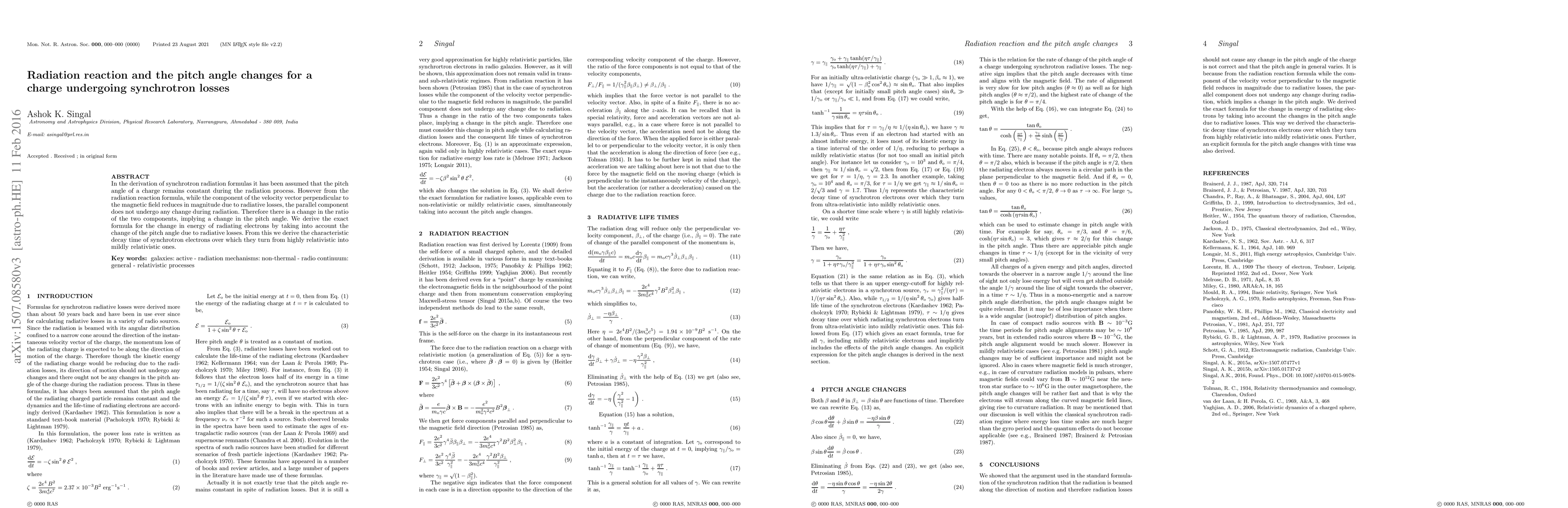 Researchers derived a formula to calculate changes in pitch angle for electrons undergoing synchrotron losses due to radiation reaction, revealing a characteristic decay time for highly relativistic to mildly relativistic electrons.