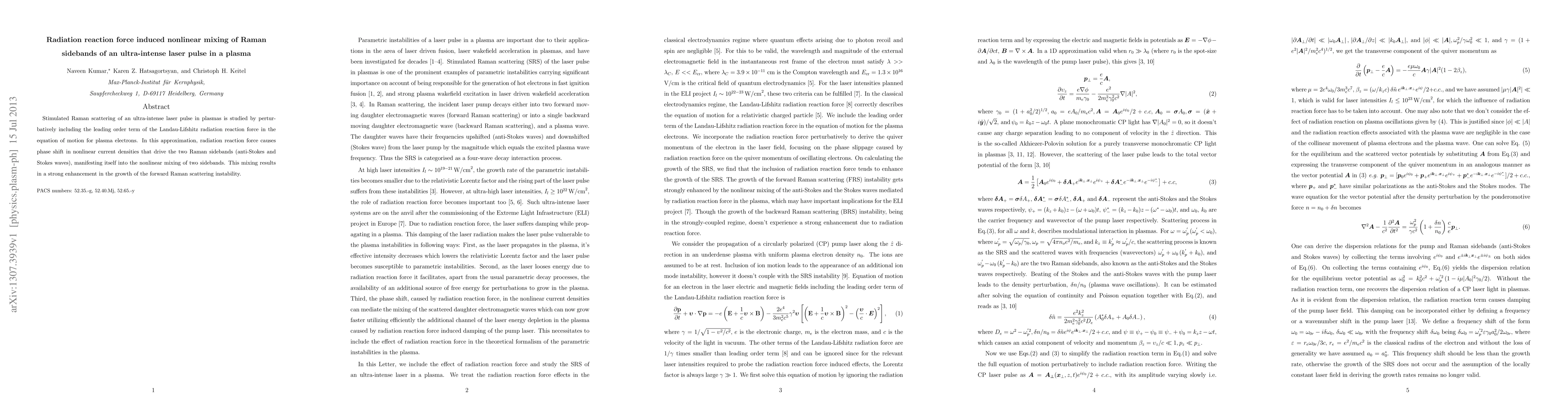 This study investigates how the radiation reaction force affects stimulated Raman scattering in plasmas, revealing that it induces nonlinear mixing of Raman sidebands, thereby significantly enhancing the growth of forward Raman scattering instability. The analysis includes the Landau-Lifshitz radiation reaction force in the electron motion equations.
