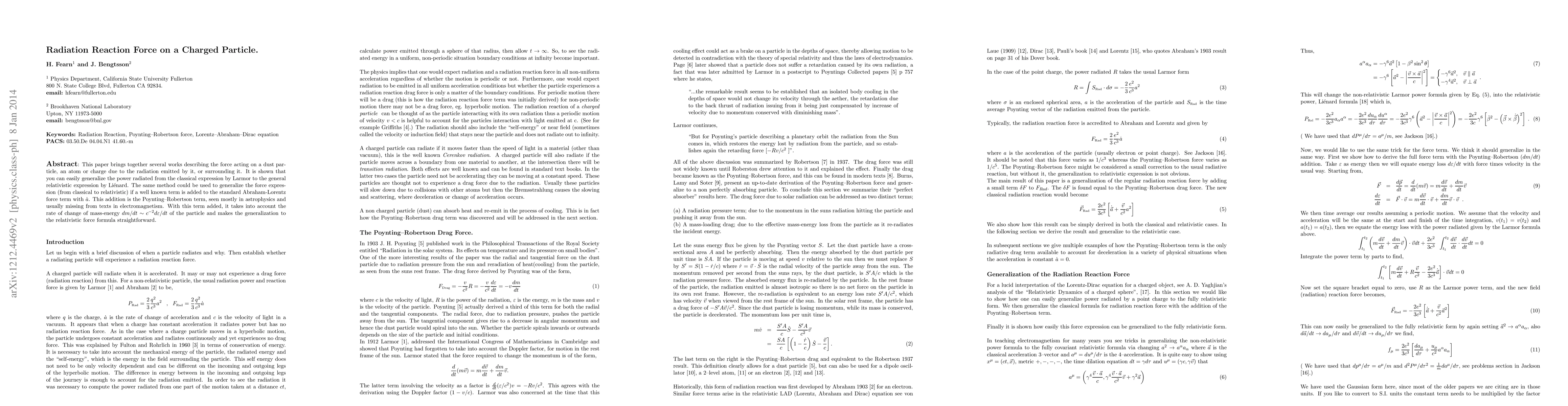 This paper corrects the incomplete Abrahamn Lorentz radiation reaction force by incorporating the Poynting-Robertson term, which accounts for the particle's mass change, thus generalizing the classical radiation reaction force to a relativistic expression.