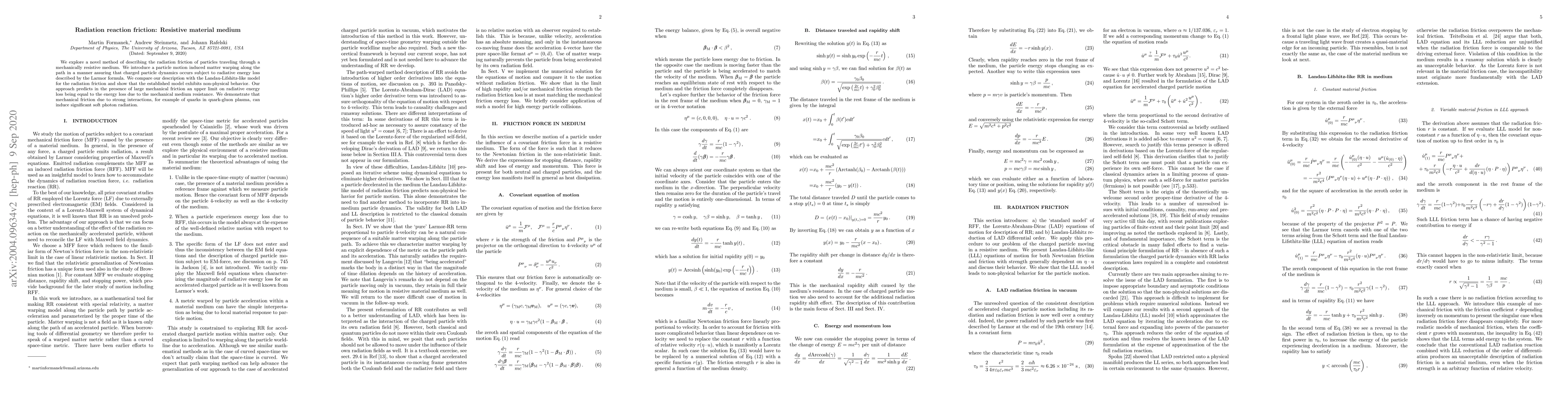 We explore a novel method of describing the radiation friction of particles traveling through a mechanically resistive medium. We introduce a particle motion induced matter warping along the path in a manner assuring that charged particle dynamics occurs subject to radiative energy loss described by the Larmor formula. We compare our description with the Landau-Lifshitz-like model for the radiation friction and show that the established model exhibits non-physical behavior. Our approach predicts in the presence of large mechanical friction an upper limit on radiative energy loss being equal to the energy loss due to the mechanical medium resistance. We demonstrate that mechanical friction due to strong interactions, for example of quarks in quark-gluon plasma, can induce significant soft photon radiation.