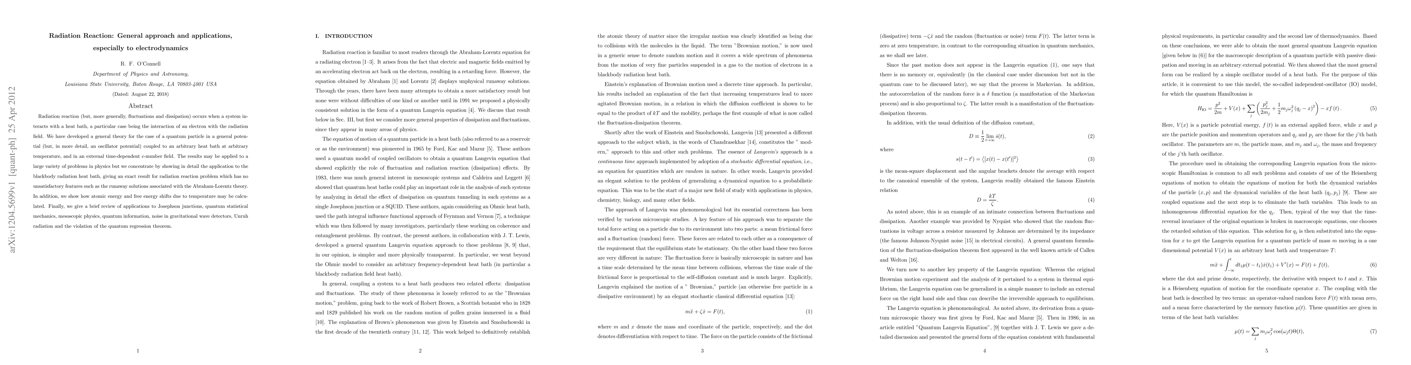 This paper develops a comprehensive theory for radiation reaction in quantum particles interacting with a heat bath, particularly focusing on the electron in an oscillator potential. It provides exact results for the radiation reaction problem, avoiding issues like runaway solutions, and extends applications to various fields including quantum information and gravitational wave detectors.