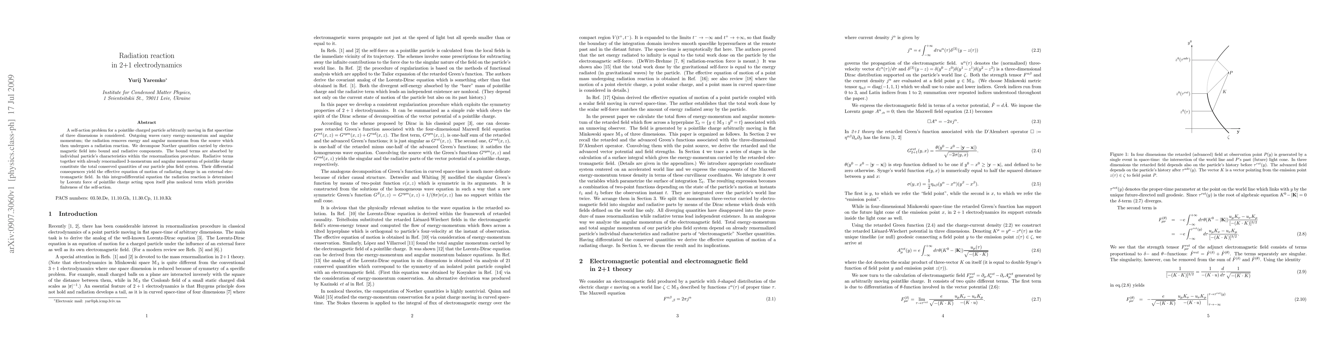 This research paper explores how a charged particle's movement in space-time creates energy-momentum and angular momentum waves that interact with the environment, leading to a self-action problem where the particle's motion affects its own behavior.