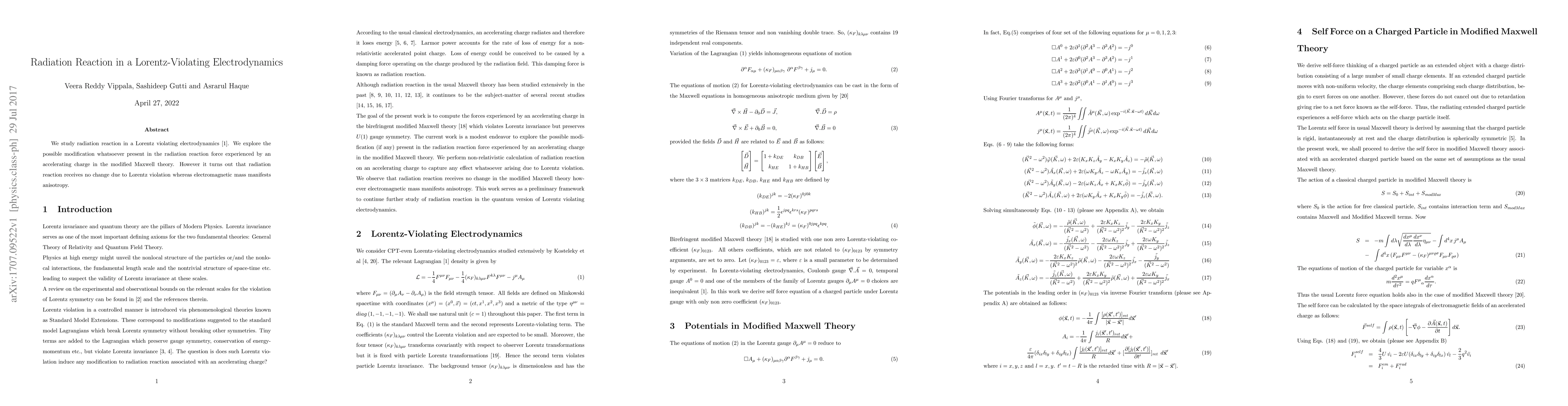 This research investigates how radiation reaction behaves in a modified electrodynamics where Lorentz symmetry is violated. Despite exploring potential modifications, the study finds that radiation reaction remains unchanged, while electromagnetic mass shows anisotropy.