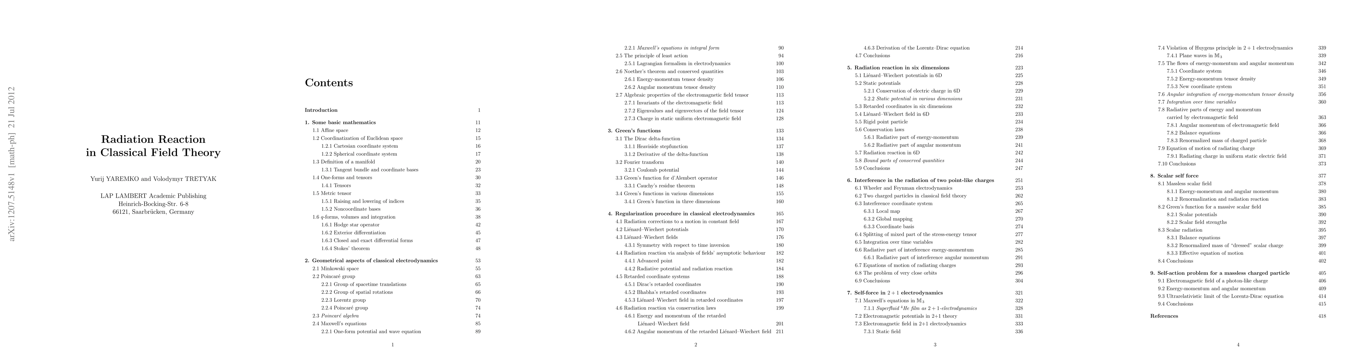 Studies of the classical theory of charged particles and their radiation initiated by Lorentz and Abraham have attracted our attention over a century. Nevertheless, the correct equation to describe the motion of a point charged particle is still a matter of controversy. And what about a charge "living" inside Flatland, a hypothetical world of two spatial dimensions? What is the equation of motion of a point charge in six dimensions? This book provides a self-contained and systematic introduction to problems of radiation and radiation reaction in classical field theory. Besides conventional electrodynamics in four dimensions (one time dimension and three spatial ones), we consider exotic worlds of dimensions other than four which arise in various research areas, e. g. in string theory, physics of graphene, dynamics of superfluid 4He film etc. Thorough analysis is given to radiation phenomena and charges' equations of motions where the radiation reaction is taken into account. The intended audience is physicist who works in relative fields or graduate student who wants a short exposition of classical electrodynamics in the language of coordinate-free differential geometry. Book Details: ISBN-13: 978-3-659-16822-2 ISBN-10: 365916822X EAN: 9783659168222