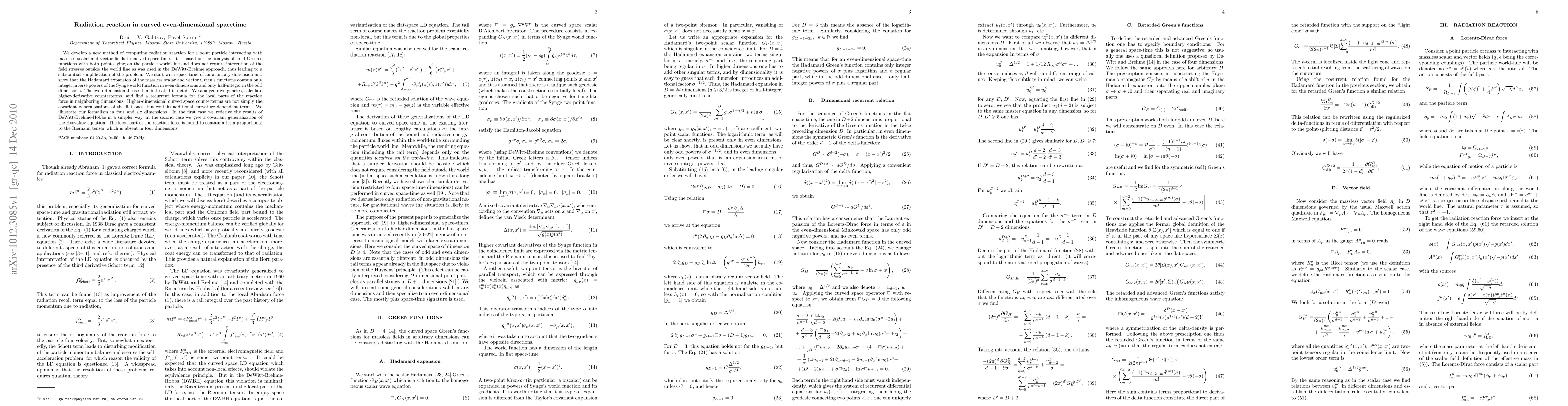 This paper introduces a novel method for computing radiation reaction for a point particle in curved even-dimensional spacetimes, simplifying the DeWitt-Brehme approach by avoiding external field stress integration. It reveals that the Hadamard expansion of massless scalar and vector fields in even dimensions contains only integer inverse powers of the Synge world function, leading to a detailed analysis of divergencies and curvature-dependent counterterms.