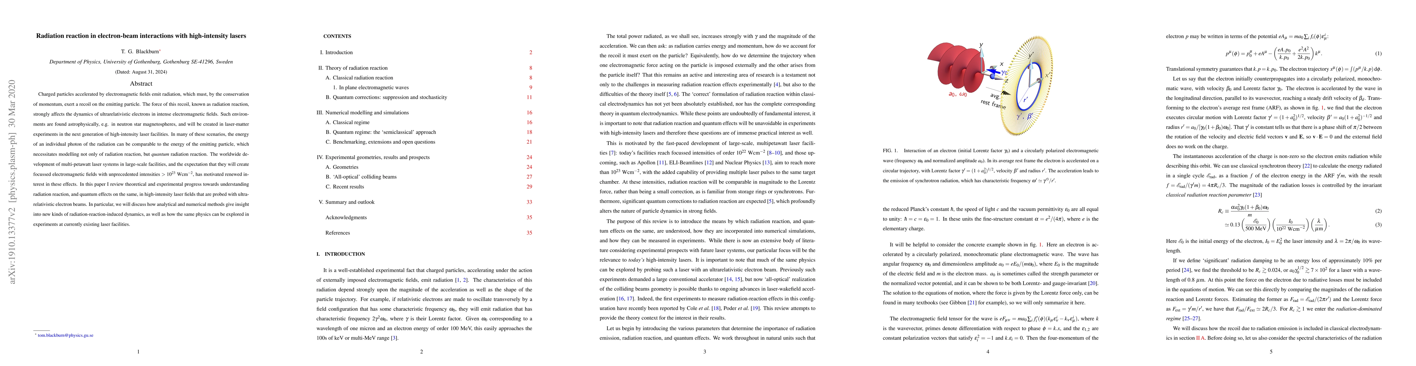 Charged particles accelerated by electromagnetic fields emit radiation, which must, by the conservation of momentum, exert a recoil on the emitting particle. The force of this recoil, known as radiation reaction, strongly affects the dynamics of ultrarelativistic electrons in intense electromagnetic fields. Such environments are found astrophysically, e.g. in neutron star magnetospheres, and will be created in laser-matter experiments in the next generation of high-intensity laser facilities. In many of these scenarios, the energy of an individual photon of the radiation can be comparable to the energy of the emitting particle, which necessitates modelling not only of radiation reaction, but quantum radiation reaction. The worldwide development of multi-petawatt laser systems in large-scale facilities, and the expectation that they will create focussed electromagnetic fields with unprecedented intensities $> 10^{23}~\mathrm{W}\text{cm}^{-2}$, has motivated renewed interest in these effects. In this paper I review theoretical and experimental progress towards understanding radiation reaction, and quantum effects on the same, in high-intensity laser fields that are probed with ultrarelativistic electron beams. In particular, we will discuss how analytical and numerical methods give insight into new kinds of radiation-reaction-induced dynamics, as well as how the same physics can be explored in experiments at currently existing laser facilities.