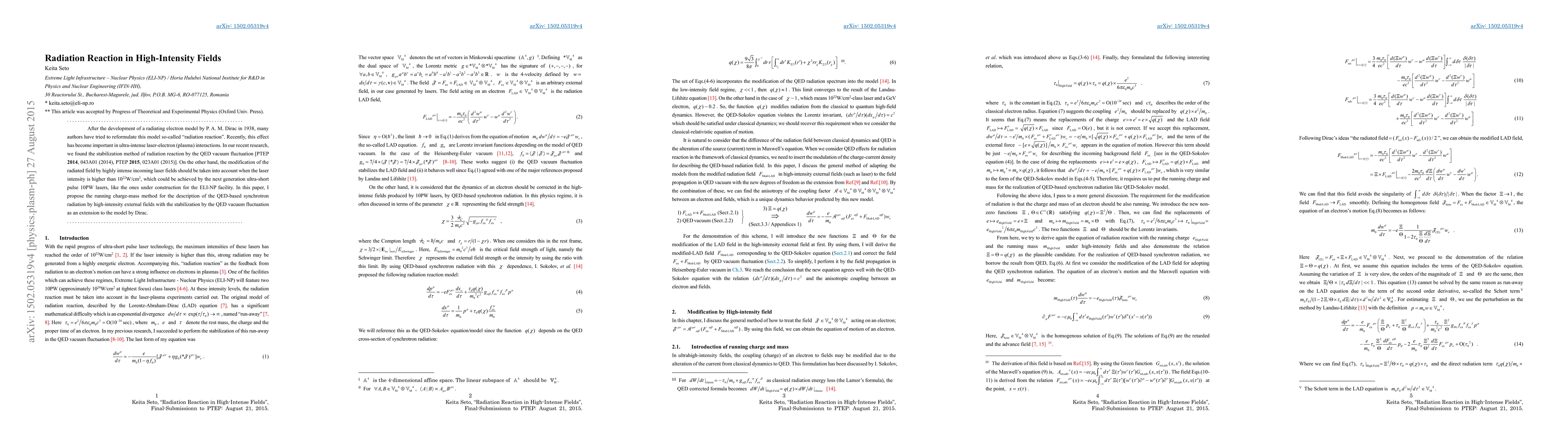 After the development of a radiating electron model by P. A. M. Dirac in 1938, many authors have tried to reformulate this model so-called radiation reaction. Recently, this effect has become important in ultra-intense laser-electron (plasma) interactions. In our recent research, we found the stabilization method of radiation reaction by the QED vacuum fluctuation [PTEP 2014, 043A01 (2014), PTEP 2015, 023A01 (2015)]. On the other hand, the modification of the radiated field by highly intense incoming laser fields should be taken into account when the laser intensity is higher than 1022W/cm2, which could be achieved by the next generation ultra-short pulse 10PW lasers, like the ones under construction for the ELI-NP facility. In this paper, I propose the running charge-mass method for the description of the QED-based synchrotron radiation by high-intensity external fields with the stabilization by the QED vacuum fluctuation as an extension to the model by Dirac.