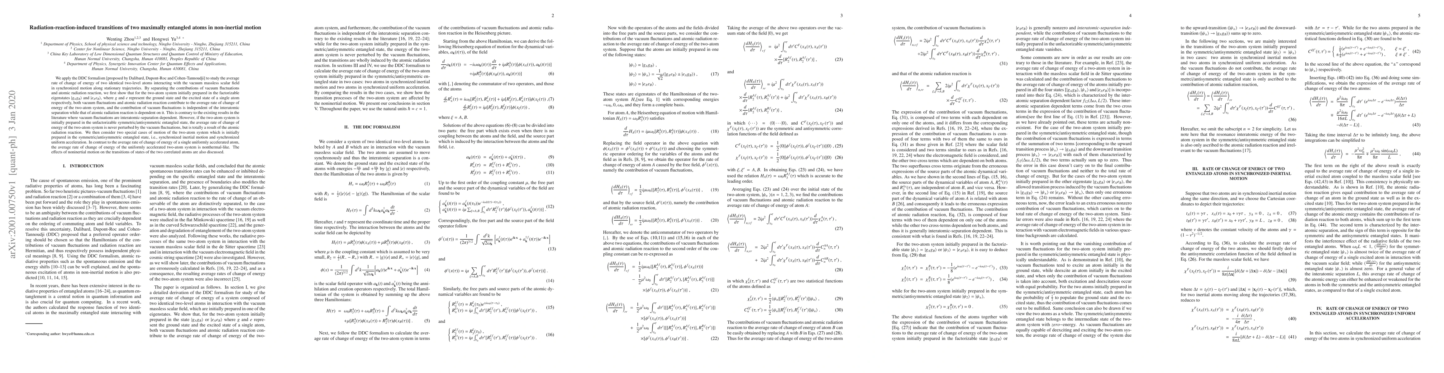 We apply the DDC formalism [proposed by Dalibard, Dupont-Roc and Cohen-Tannoudji] to study the average rate of change of energy of two identical two-level atoms interacting with the vacuum massless scalar field in synchronized motion along stationary trajectories. By separating the contributions of vacuum fluctuations and atomic radiation reaction, we first show that for the two-atom system initially prepared in the factorizable eigenstates $|g_Ag_B\rangle$ and $|e_Ae_B\rangle$, where $g$ and $e$ represent the ground state and the excited state of a single atom respectively, both vacuum fluctuations and atomic radiation reaction contribute to the average rate of change of energy of the two-atom system, and the contribution of vacuum fluctuations is independent of the interatomic separation while that of atomic radiation reaction is dependent on it. This is contrary to the existing results in the literature where vacuum fluctuations are interatomic-separation dependent. However, if the two-atom system is initially prepared in the unfactorizable symmetric/antisymmetric entangled state, the average rate of change of energy of the two-atom system is never perturbed by the vacuum fluctuations, but is totally a result of the atomic radiation reaction. We then consider two special cases of motion of the two-atom system which is initially prepared in the symmetric/antisymmetric entangled state, i.e., synchronized inertial motion and synchronized uniform acceleration. In contrast to the average rate of change of energy of a single uniformly accelerated atom, the average rate of change of energy of the uniformly accelerated two-atom system is nonthermal-like. The effects of noninertial motion on the transitions of states of the two correlated atoms are also discussed.