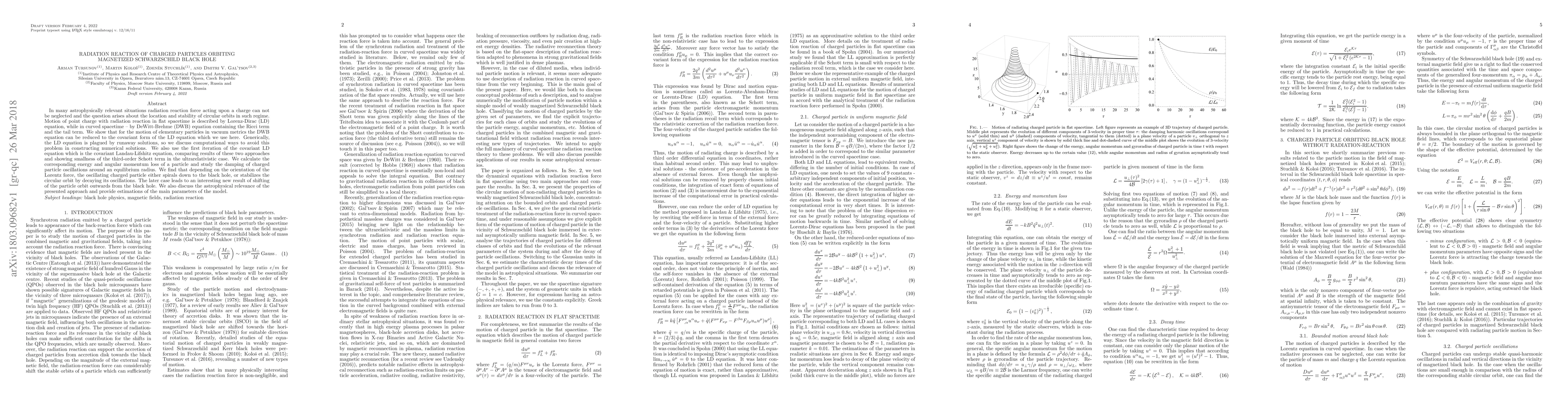 In many astrophysically relevant situations radiation reaction force acting upon a charge can not be neglected and the question arises about the location and stability of circular orbits in such regime. Motion of point charge with radiation reaction in flat spacetime is described by Lorenz-Dirac (LD) equation, while in curved spacetime -- by DeWitt-Brehme (DWB) equation containing the Ricci term and the tail term. We show that for the motion of elementary particles in vacuum metrics the DWB equation can be reduced to the covariant form of the LD equation which we use here. Generically, the LD equation is plagued by runaway solutions, so we discuss computational ways to avoid this problem in constructing numerical solutions. We also use the first iteration of the covariant LD equation which is the covariant Landau-Lifshitz equation, comparing results of these two approaches and showing smallness of the third-order Schott term in the ultrarelativistic case. We calculate the corresponding energy and angular momentum loss of a particle and study the damping of charged particle oscillations around an equilibrium radius. We find that depending on the orientation of the Lorentz force, the oscillating charged particle either spirals down to the black hole, or stabilizes the circular orbit by decaying its oscillations. The later case leads to an interesting new result of shifting of the particle orbit outwards from the black hole. We also discuss the astrophysical relevance of the presented approach and provide estimations of the main parameters of the model.