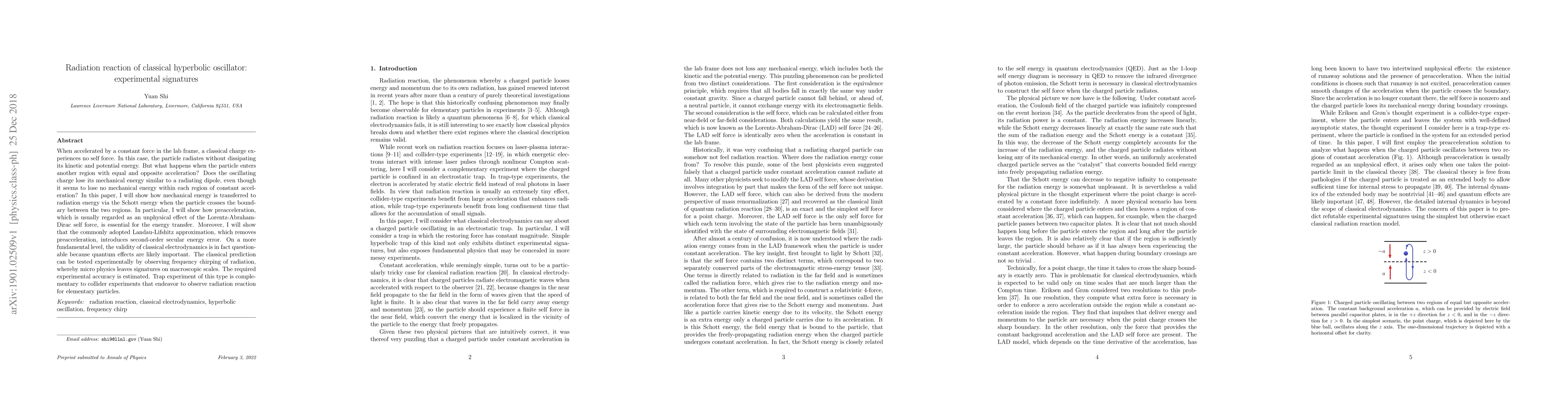 When accelerated by a constant force in the lab frame, a classical charge experiences no self force. In this case, the particle radiates without dissipating its kinetic and potential energy. But what happens when the particle enters another region with equal and opposite acceleration? Does the oscillating charge lose its mechanical energy similar to a radiating dipole, even though it seems to lose no mechanical energy within each region of constant acceleration? In this paper, I will show how mechanical energy is transferred to radiation energy via the Schott energy when the particle crosses the boundary between the two regions. In particular, I will show how preacceleration, which is usually regarded as an unphysical effect of the Lorentz-Abraham-Dirac self force, is essential for the energy transfer. Moreover, I will show that the commonly adopted Landau-Lifshitz approximation, which removes preacceleration, introduces second-order secular energy error. On a more fundamental level, the validity of classical electrodynamics is in fact questionable because quantum effects are likely important. The classical prediction can be tested experimentally by observing frequency chirping of radiation, whereby micro physics leaves signatures on macroscopic scales. The required experimental accuracy is estimated. Trap experiment of this type is complementary to collider experiments that endeavor to observe radiation reaction for elementary particles.