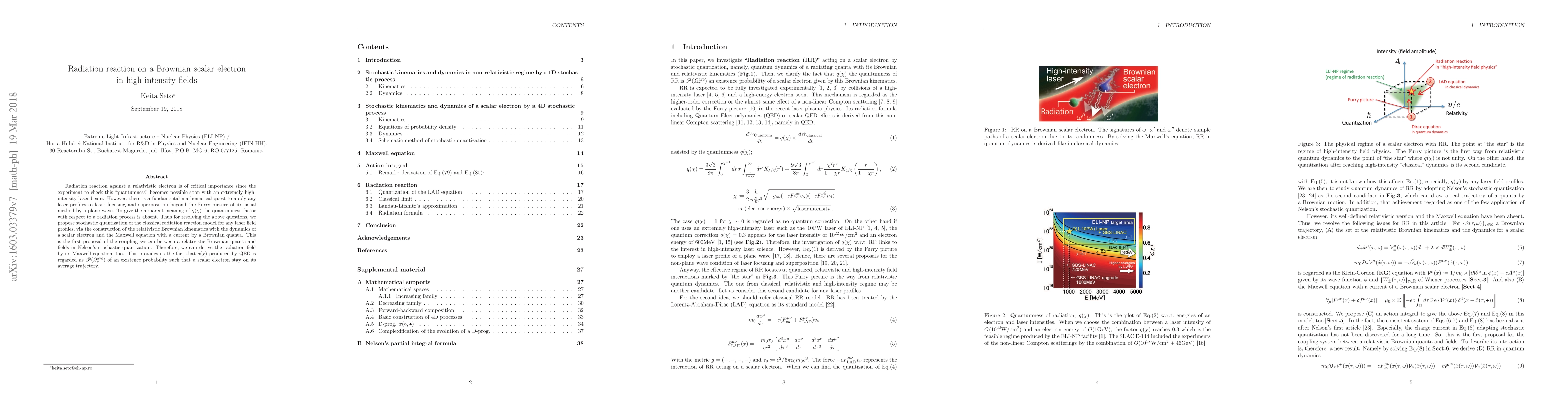Radiation reaction against a relativistic electron is of critical importance since the experiment to check this "quantumness" becomes possible soon with an extremely high-intensity laser beam. However, there is a fundamental mathematical quest to apply any laser profiles to laser focusing and superposition beyond the Furry picture of its usual method by a plane wave. To give the apparent meaning of $q(\chi)$ the quantumness factor with respect to a radiation process is absent. Thus for resolving the above questions, we propose stochastic quantization of the classical radiation reaction model for any laser field profiles, via the construction of the relativistic Brownian kinematics with the dynamics of a scalar electron and the Maxwell equation with a current by a Brownian quanta. This is the first proposal of the coupling system between a relativistic Brownian quanta and fields in Nelson's stochastic quantization. Therefore, we can derive the radiation field by its Maxwell equation, too. This provides us the fact that $q(\chi)$ produced by QED is regarded as $\mathscr{P}(\varOmega_{\tau}^{\mathrm{ave}})$ of an existence probability such that a scalar electron stay on its average trajectory.
