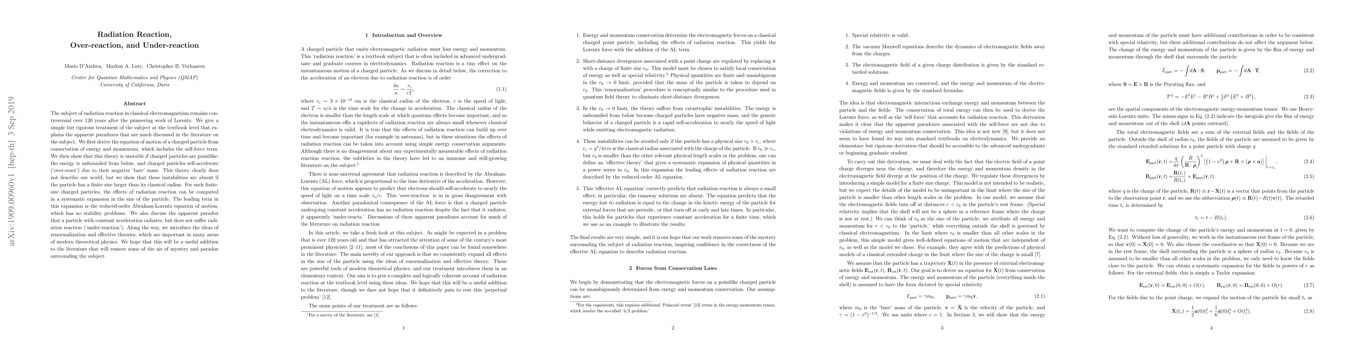The subject of radiation reaction in classical electromagnetism remains controversial over 120 years after the pioneering work of Lorentz. We give a simple but rigorous treatment of the subject at the textbook level that explains the apparent paradoxes that are much discussed in the literature on the subject. We first derive the equation of motion of a charged particle from conservation of energy and momentum, which includes the self-force term. We then show that this theory is unstable if charged particles are pointlike: the energy is unbounded from below, and charged particles self-accelerate (`over-react') due to their negative `bare' mass. This theory clearly does not describe our world, but we show that these instabilities are absent if the particle has a finite size larger than its classical radius. For such finite-size charged particles, the effects of radiation reaction can be computed in a systematic expansion in the size of the particle. The leading term in this expansion is the reduced-order Abraham-Lorentz equation of motion, which has no stability problems. We also discuss the apparent paradox that a particle with constant acceleration radiates, but does not suffer radiation reaction (`under-reaction'). Along the way, we introduce the ideas of renormalization and effective theories, which are important in many areas of modern theoretical physics. We hope that this will be a useful addition to the literature that will remove some of the air of mystery and paradox surrounding the subject.