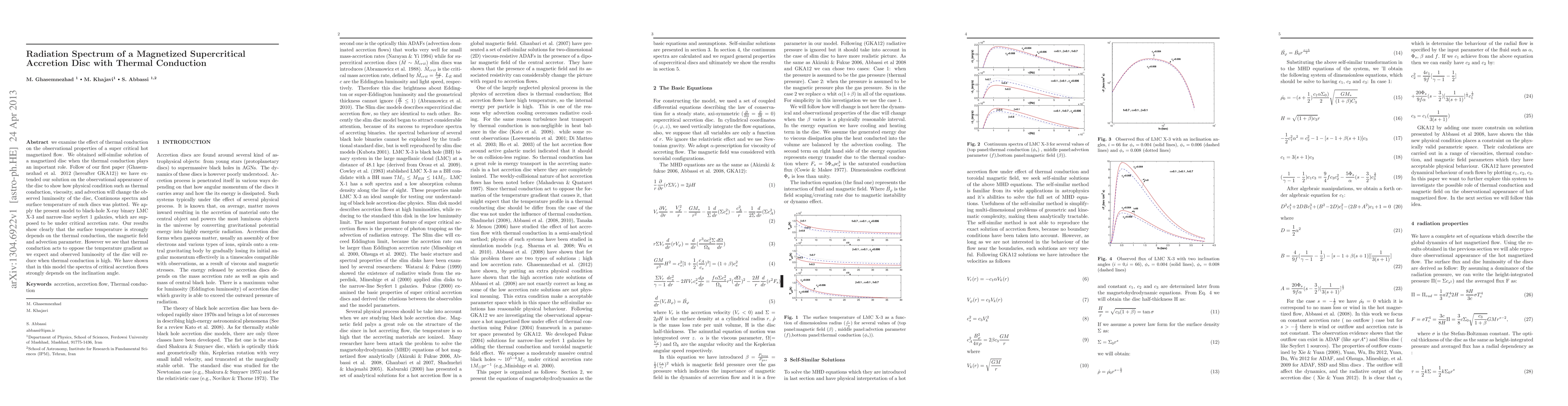 We examine the effect of thermal conduction on the observational properties of a super critical hot magnetized flow. We obtained self-similar solution of a magnetized disc when the thermal conduction plays an important role. Follow of our first paper (Ghasemnezhad et al. 2012 (hereafter GKA12)) we have extended our solution on the observational appearance of the disc to show how physical condition such as thermal conduction, viscosity, and advection will change the observed luminosity of the disc, Continuous spectra and surface temperature of such discs was plotted. We apply the present model to black-hole X-ray binary LMC X-3 and narrow-line seyfert 1 galaxies, which are supposed to be under critical accretion rate. Our results show clearly that the surface temperature is strongly depends on the thermal conduction, the magnetic field and advection parameter. However we see that thermal conduction acts to oppose the temperature gradient as we expect and observed luminosity of the disc will reduce when thermal conduction is high. We have shown that in this model the spectra of critical accretion flows strongly depends on the inclination angle.