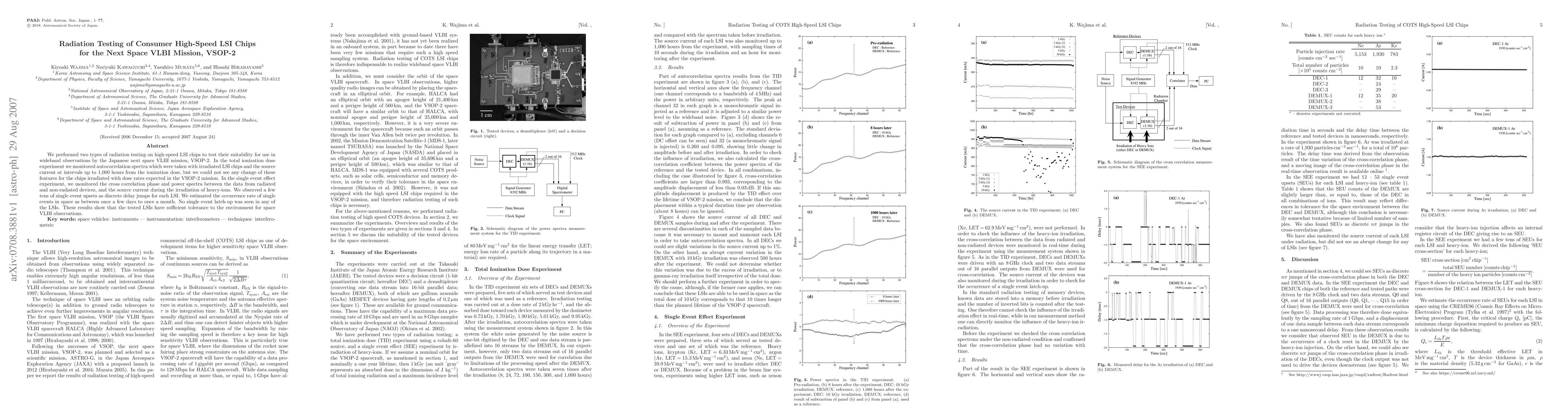 This study tested high-speed LSI chips for the VSOP-2 space VLBI mission through ionization dose and single event effect experiments. Results showed no significant performance changes under expected space radiation conditions, indicating the chips' suitability for space observations.
