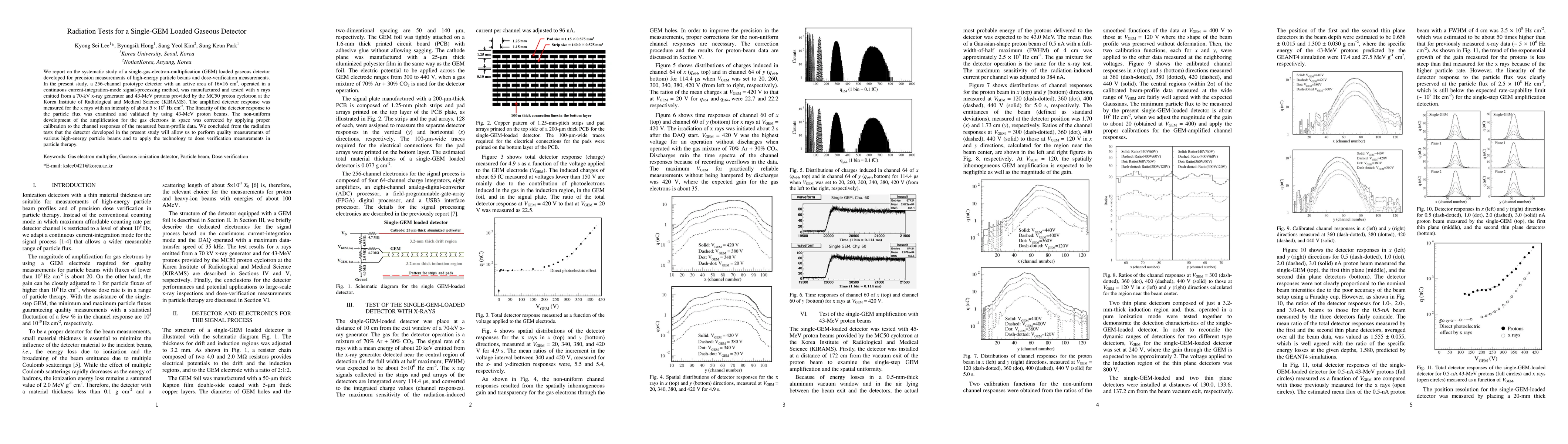 We report on the systematic study of a single-gas-electron-multiplication (GEM) loaded gaseous detector developed for precision measurements of high-energy particle beams and dose-verification measurements. In the present study, a 256-channel prototype detector with an active area of 16$\times$16 cm$^{2}$, operated in a continuous current-integration-mode signal-processing method, was manufactured and tested with x rays emitted from a 70-kV x-ray generator and 43-MeV protons provided by the MC50 proton cyclotron at the Korea Institute of Radiological and Medical Science (KIRAMS). The amplified detector response was measured for the x rays with an intensity of about 5$\times$10$^{6}$ Hz cm$^{-2}$. The linearity of the detector response to the particle flux was examined and validated by using 43-MeV proton beams. The non-uniform development of the amplification for the gas electrons in space was corrected by applying proper calibration to the channel responses of the measured beam-profile data. We concluded from the radiation tests that the detector developed in the present study will allow us to perform quality measurements of various high-energy particle beams and to apply the technology to dose verification measurements in particle therapy.