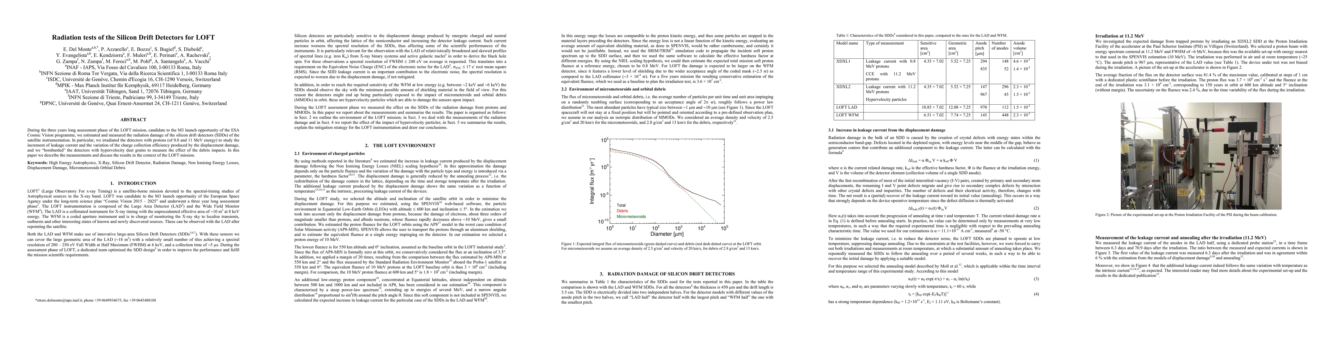 This paper details radiation tests conducted on Silicon Drift Detectors (SDDs) for the LOFT mission, assessing radiation damage through proton irradiation and hypervelocity dust grain bombardment to evaluate leakage current and charge collection efficiency, crucial for the satellite's performance. The results inform the design and operational readiness of the LOFT mission's instrumentation.