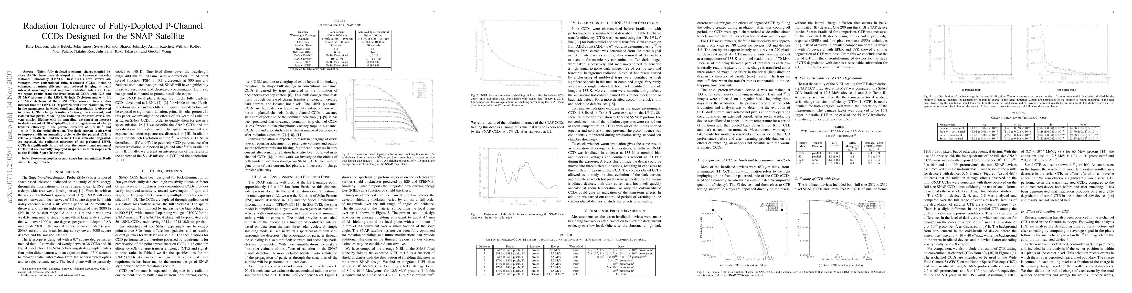 This study investigates the radiation tolerance of fully-depleted p-channel CCDs developed at LBNL, showing significant improvement over conventional n-channel CCDs in terms of charge transfer efficiency and dark current after proton and electron irradiation. The results suggest minimal degradation over a six-year mission, with dark current improvements noted post-annealing.