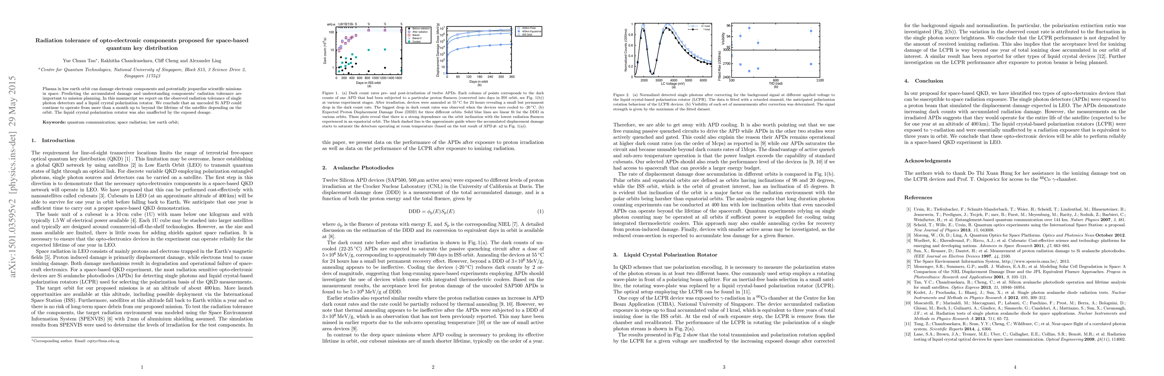 Plasma in low earth orbit can damage electronic components and potentially jeopardise the scientific missions in space. Predicting the accumulated damage and understanding the components' radiation tolerance are important to mission planning. In this manuscript we report on the observed radiation tolerance of single photon detectors and a liquid crystal polarization rotator. We conclude that an uncooled Si APD could continue to operate from more than a month up to beyond the lifetime of the satellite depending on the orbit. The polarization rotator was also unaffected by the exposed dosage.