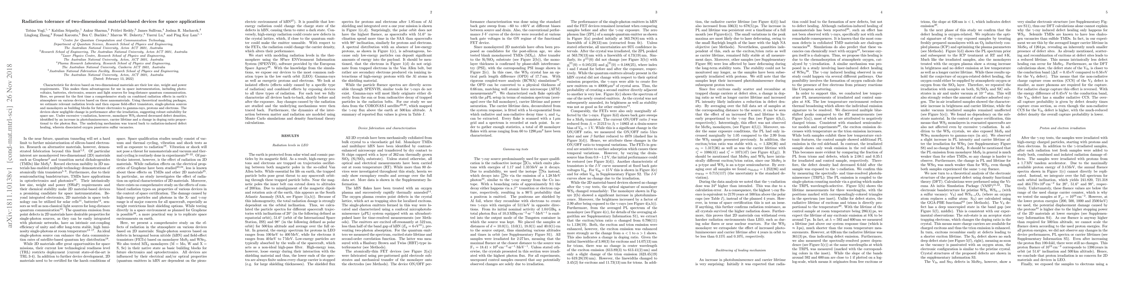 Characteristic for devices based on two-dimensional materials are their low size, weight and power requirements. This makes them advantageous for use in space instrumentation, including photovoltaics, batteries, electronics, sensors and light sources for long-distance quantum communication. Here, we present for the first time a comprehensive study on combined radiation effects in earth's atmosphere on various devices based on these nanomaterials. Using theoretical modeling packages, we estimate relevant radiation levels and then expose field-effect transistors, single-photon sources and monolayers as building blocks for future electronics to gamma-rays, protons and electrons. The devices show negligible change in performance after the irradiation, suggesting robust suitability for space use. Under excessive $\gamma$-radiation, however, monolayer WS$_2$ showed decreased defect densities, identified by an increase in photoluminescence, carrier lifetime and a change in doping ratio proportional to the photon flux. The underlying mechanism was traced back to radiation-induced defect healing, wherein dissociated oxygen passivates sulfur vacancies.