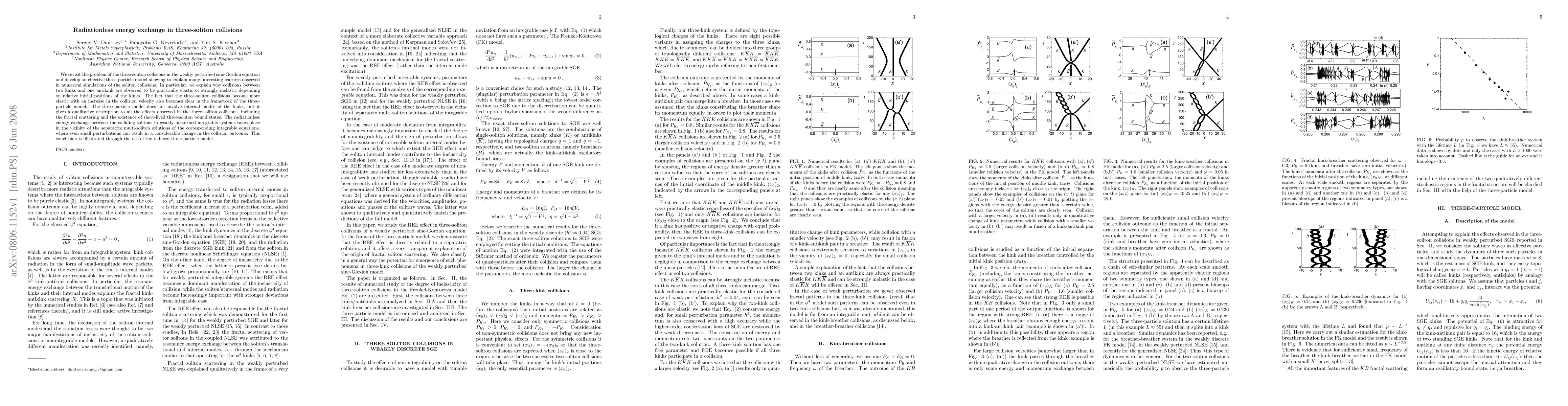 This paper develops a three-particle model to explain the radiationless energy exchange in three-soliton collisions in the sine-Gordon equation, showing that the collision outcomes depend on initial positions and velocities, and that the model captures observed fractal scattering and bound states.