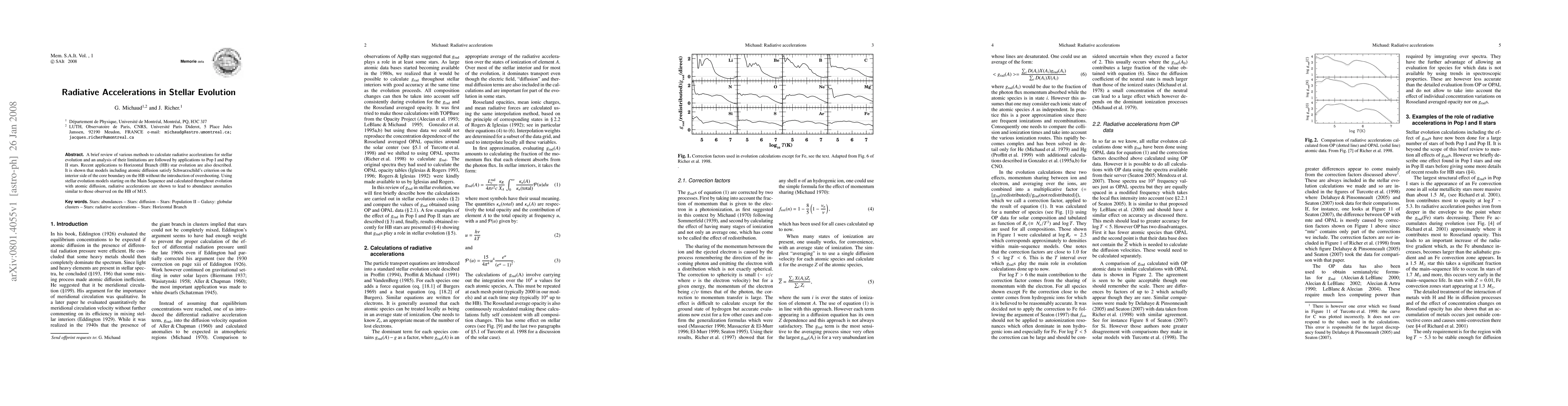 A brief review of various methods to calculate radiative accelerations for stellar evolution and an analysis of their limitations are followed by applications to Pop I and Pop II stars. Recent applications to Horizontal Branch (HB) star evolution are also described. It is shown that models including atomic diffusion satisfy Schwarzschild's criterion on the interior side of the core boundary on the HB without the introduction of overshooting. Using stellar evolution models starting on the Main Sequence and calculated throughout evolution with atomic diffusion, radiative accelerations are shown to lead to abundance anomalies similar to those observed on the HB of M15.