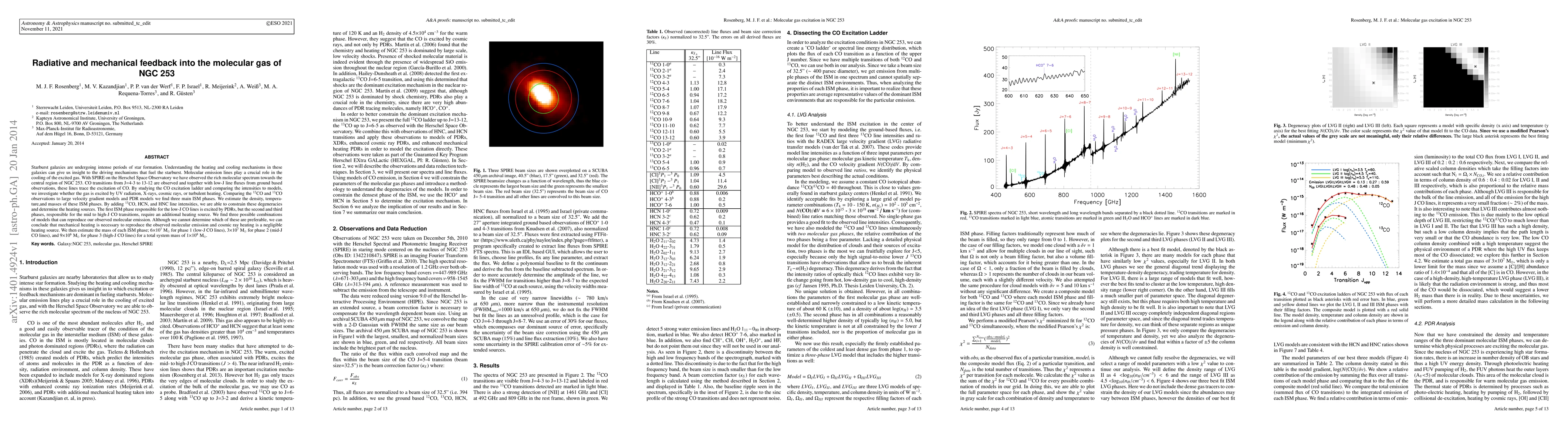 Starburst galaxies are undergoing intense periods of star formation. Understanding the heating and cooling mechanisms in these galaxies can give us insight to the driving mechanisms that fuel the starburst. Molecular emission lines play a crucial role in the cooling of the excited gas. With SPIRE on the Herschel Space Observatory we have observed the rich molecular spectrum towards the central region of NGC 253. CO transitions from J=4-3 to 13-12 are observed and together with low-J line fluxes from ground based observations, these lines trace the excitation of CO. By studying the CO excitation ladder and comparing the intensities to models, we investigate whether the gas is excited by UV radiation, X-rays, cosmic rays, or turbulent heating. Comparing the $^{12}$CO and $^{13}$CO observations to large velocity gradient models and PDR models we find three main ISM phases. We estimate the density, temperature,and masses of these ISM phases. By adding $^{13}$CO, HCN, and HNC line intensities, we are able to constrain these degeneracies and determine the heating sources. The first ISM phase responsible for the low-J CO lines is excited by PDRs, but the second and third phases, responsible for the mid to high-J CO transitions, require an additional heating source. We find three possible combinations of models that can reproduce our observed molecular emission. Although we cannot determine which of these are preferable, we can conclude that mechanical heating is necessary to reproduce the observed molecular emission and cosmic ray heating is a negligible heating source. We then estimate the mass of each ISM phase; $6\times 10^7$ M$_\odot$ for phase 1 (low-J CO lines), $3\times 10^7$ M$_\odot$ for phase 2 (mid-J CO lines), and $9\times 10^6$ M$_\odot$ for phase 3 (high-J CO lines) for a total system mass of $1\times10^{8}$ M$_\odot$.