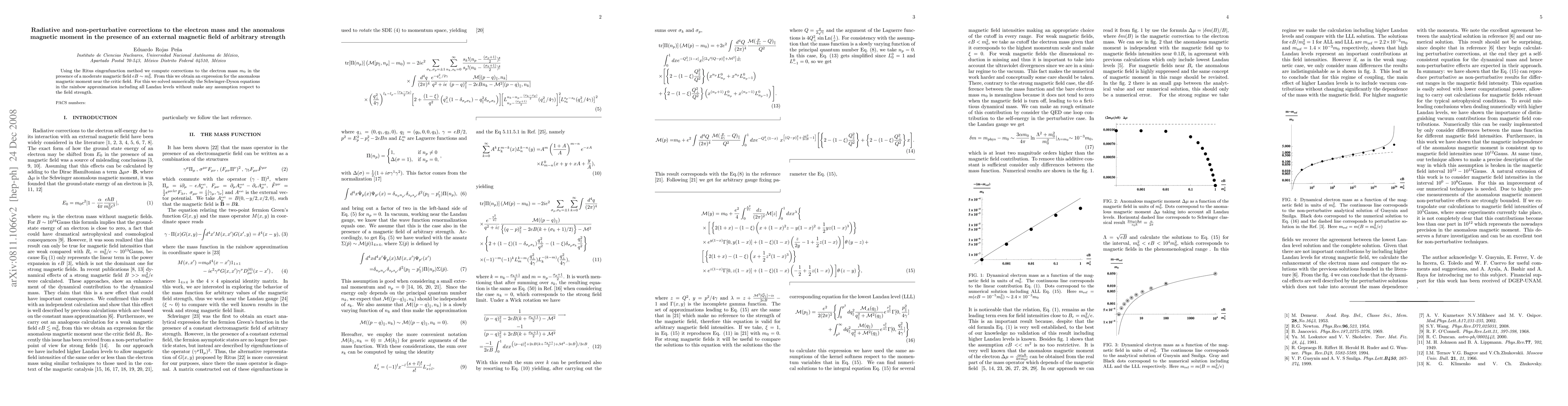 Using the Ritus eingenfunction method we compute corrections to the electron mass m_{0} in the presence of a moderate magnetic field eB ~ m_0^2. From this we obtain an expression for the anomalous magnetic moment near the critic field. For this we solved numerically the Schwinger-Dyson equations in the rainbow approximation including all Landau levels without make any assumption respect to the field strength.
