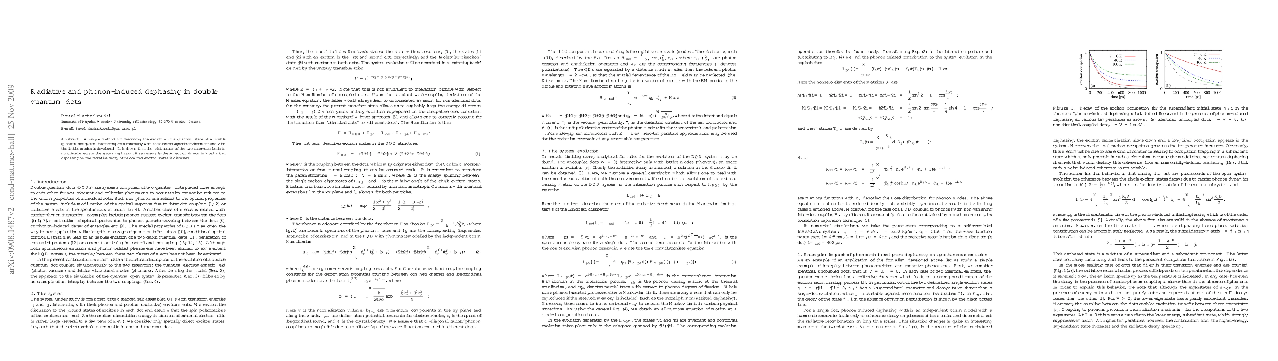 This paper develops a method to describe the evolution of a double quantum dot system's quantum state, showing that interactions with electromagnetic and lattice modes lead to nontrivial dephasing effects. It specifically examines how phonon-induced initial dephasing influences the radiative decay of delocalized exciton states.