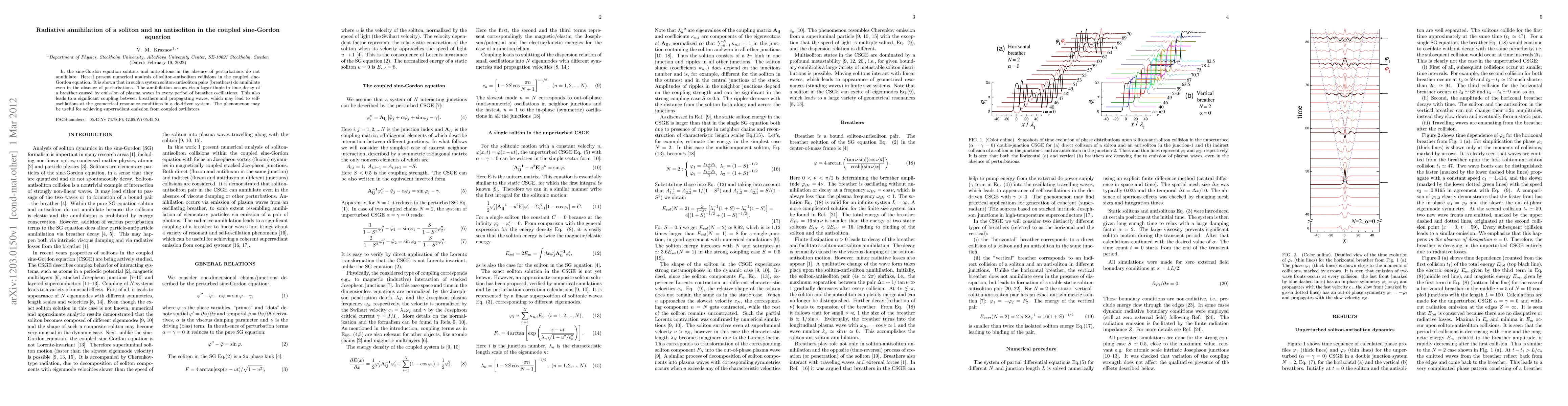 This paper presents a numerical analysis of soliton-antisoliton interactions in the coupled sine-Gordon equation, demonstrating that these pairs annihilate via a logarithmic-in-time decay due to emitted plasma waves, potentially enabling self-oscillations and superradiant emission in driven systems.