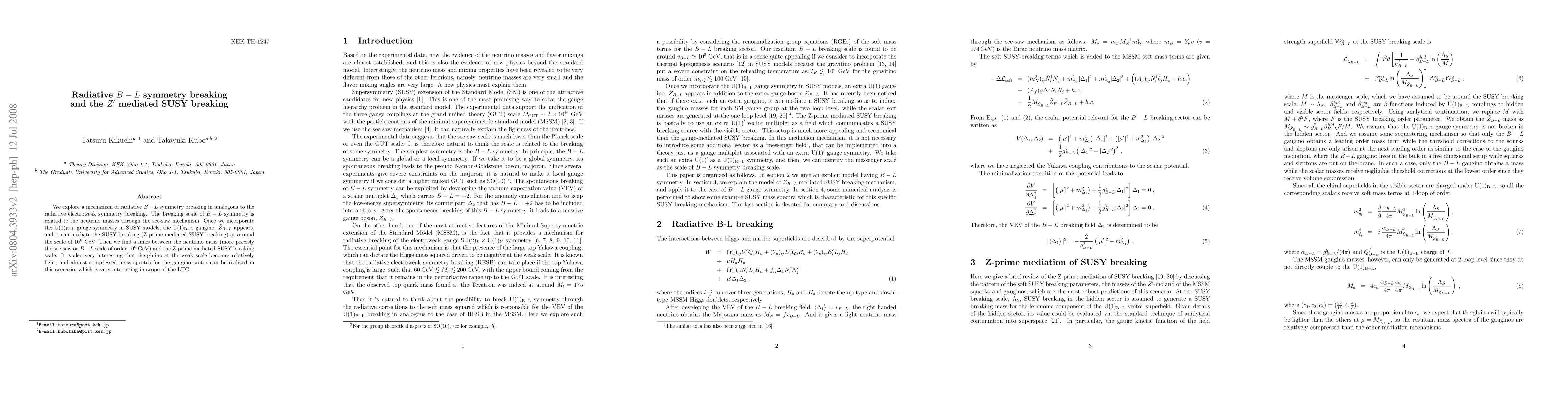 This paper investigates a radiative mechanism for breaking B-L symmetry akin to electroweak symmetry breaking, linking it to the see-saw mechanism for neutrino masses. It introduces a Z' boson from U(1)_{B-L} gauge symmetry to mediate SUSY breaking at around 10^6 GeV, establishing a connection between the B-L scale and the SUSY breaking scale, and predicting a relatively light gluino and compressed gaugino masses relevant for LHC studies.