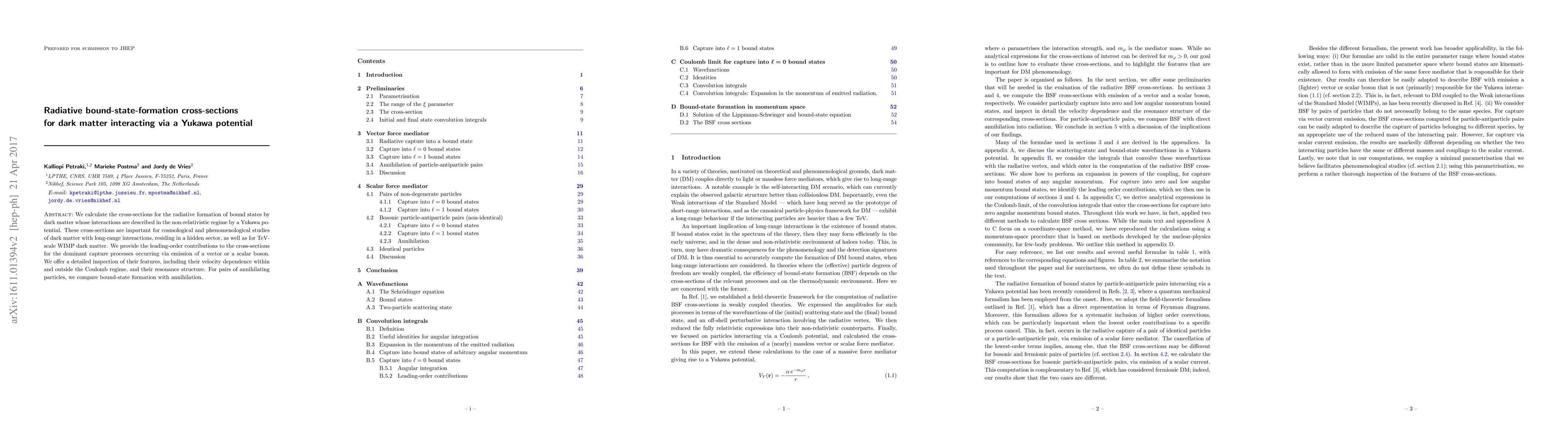 This paper calculates the radiative bound-state-formation cross-sections for dark matter interacting via a Yukawa potential, focusing on long-range interactions in hidden sectors and TeV-scale WIMP dark matter. It provides leading-order contributions for capture processes involving vector or scalar boson emission, analyzing their velocity dependence and resonance structure.
